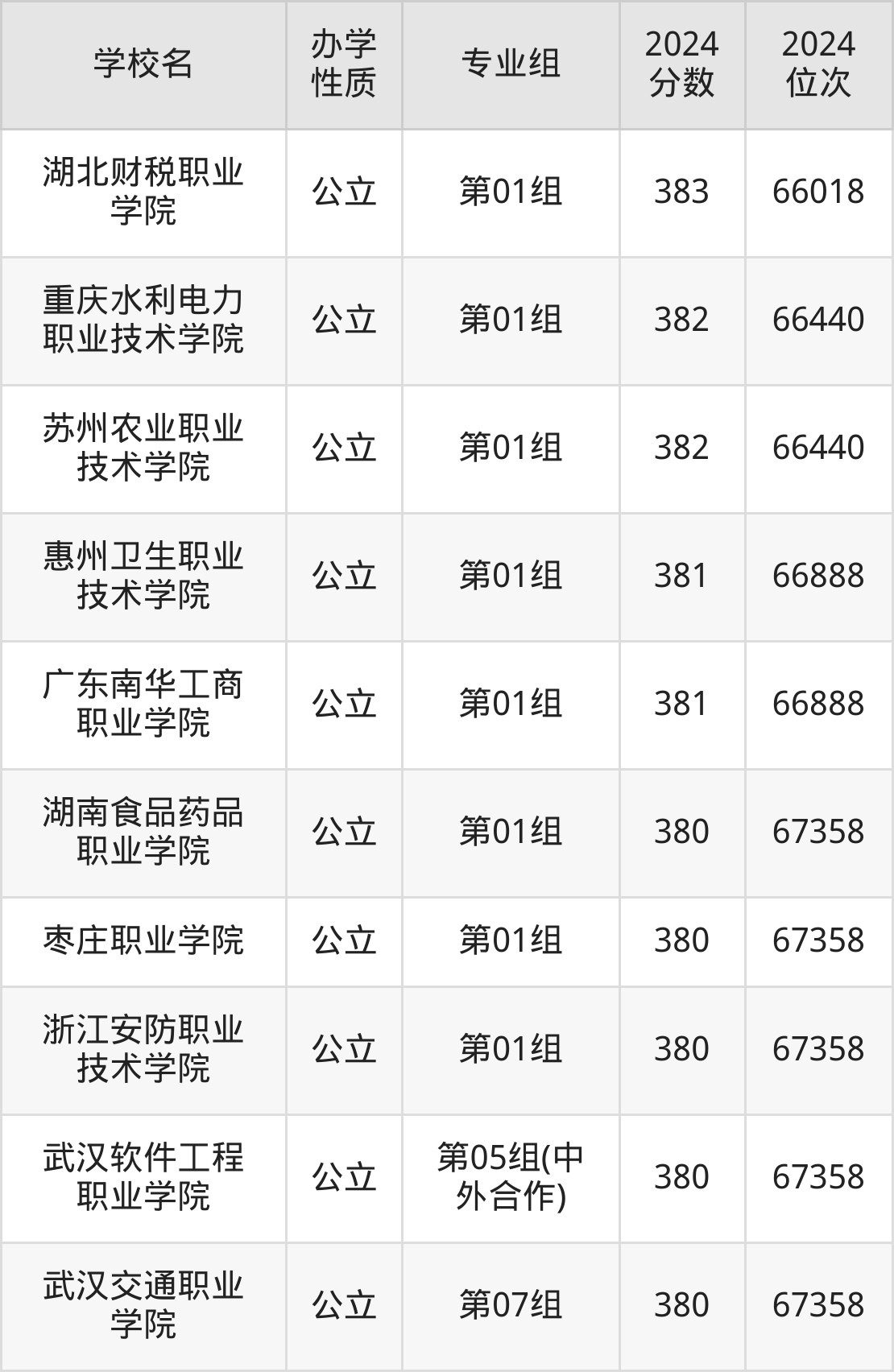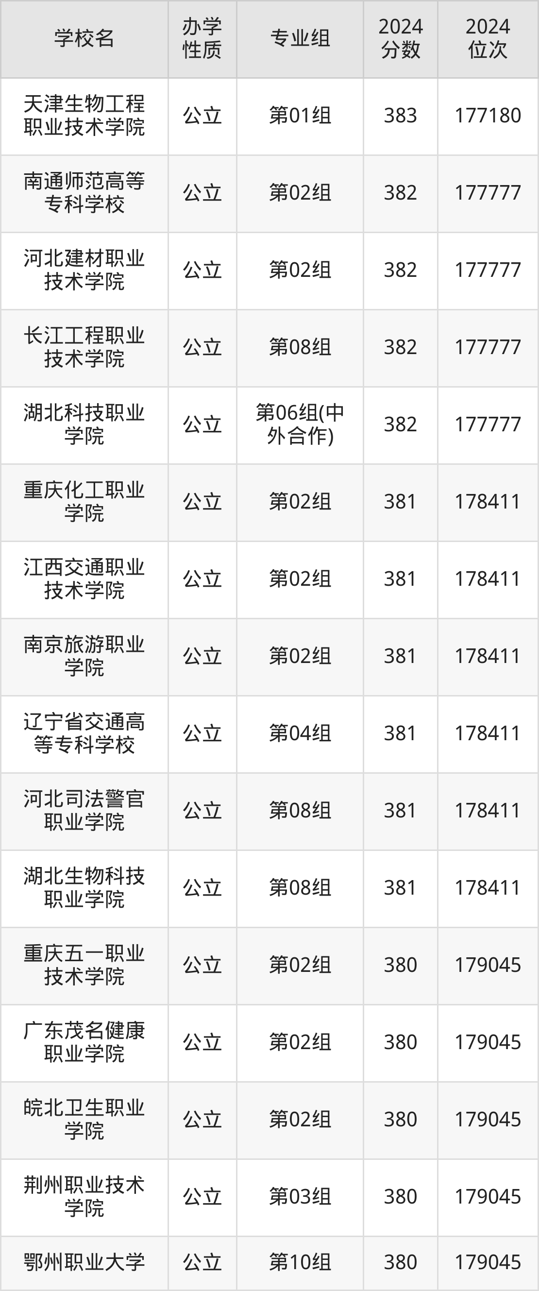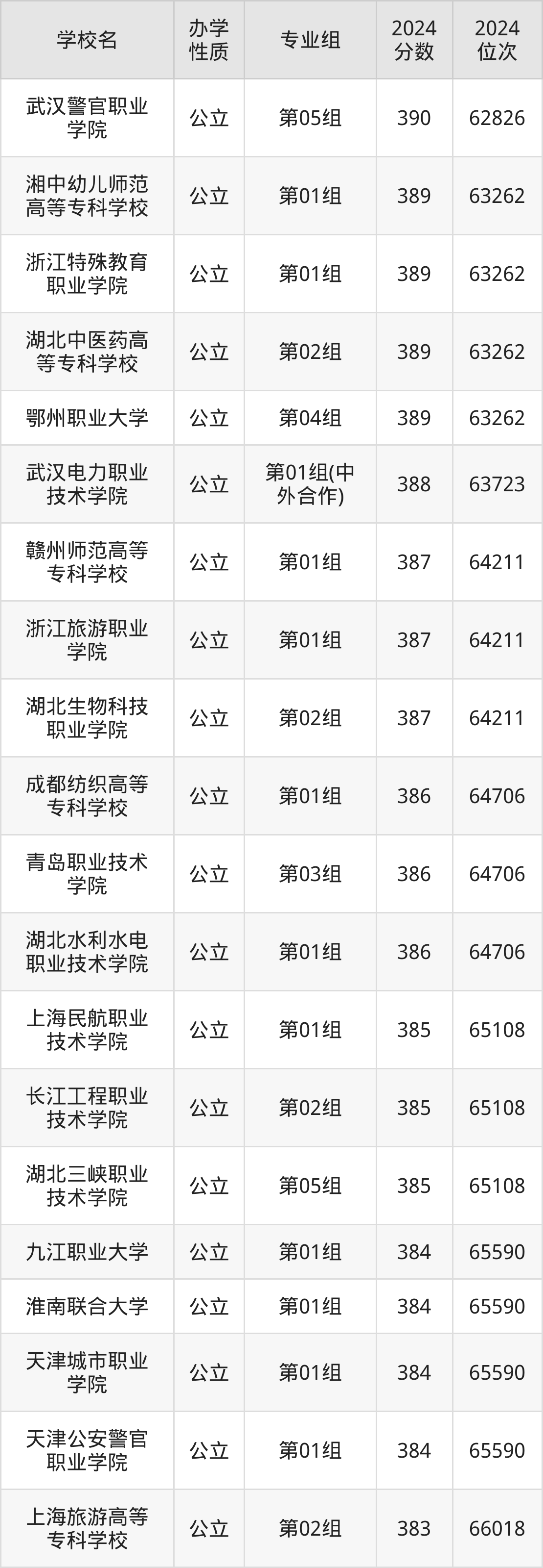 2024年湖北历史类385分考生能上武汉警官职业学院、湘中幼儿师范高等专科学校、浙江特殊教育职业学院、湖北中医药高等专科学校、鄂州职业大学等30所专科院校,具体录取分数线及位次为: