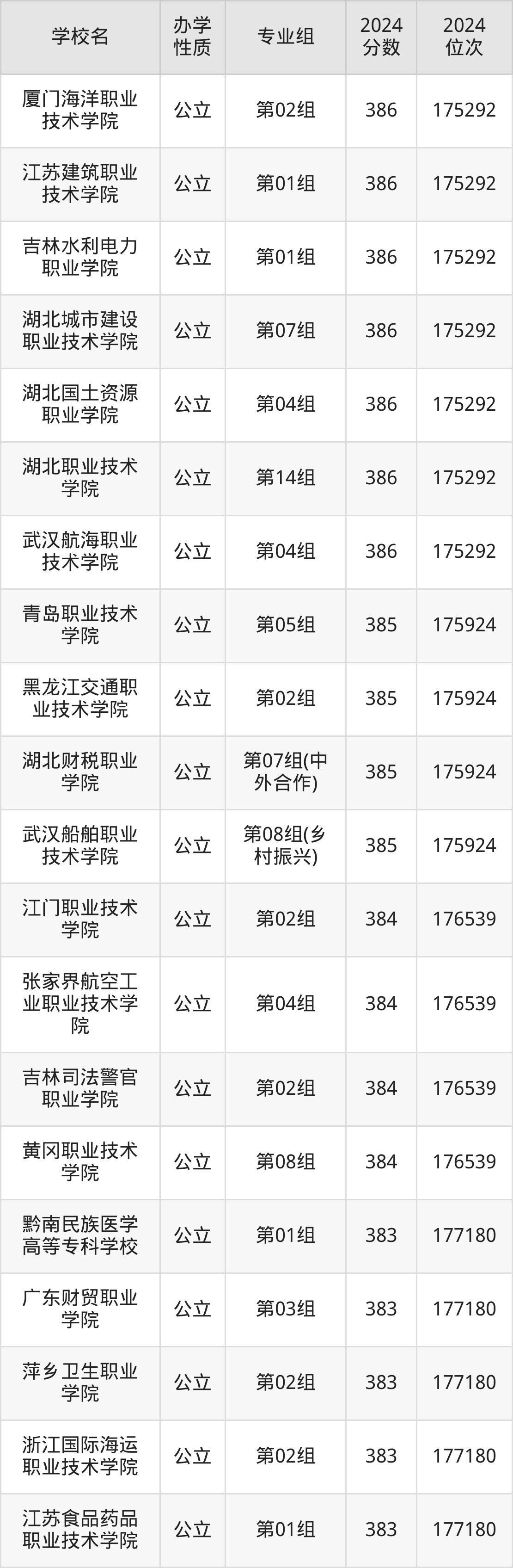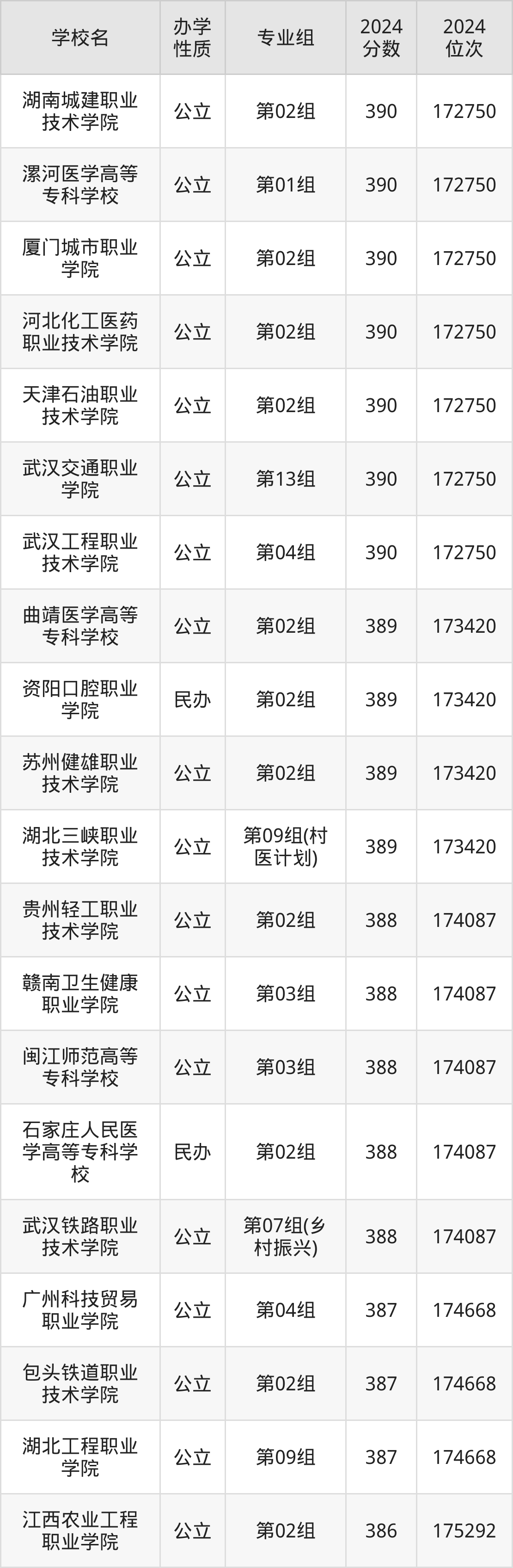 2024年湖北物理类385分考生能上湖南城建职业技术学院、漯河医学高等专科学校、厦门城市职业学院、河北化工医药职业技术学院、天津石油职业技术学院等56所专科院校,具体录取分数线及位次为: