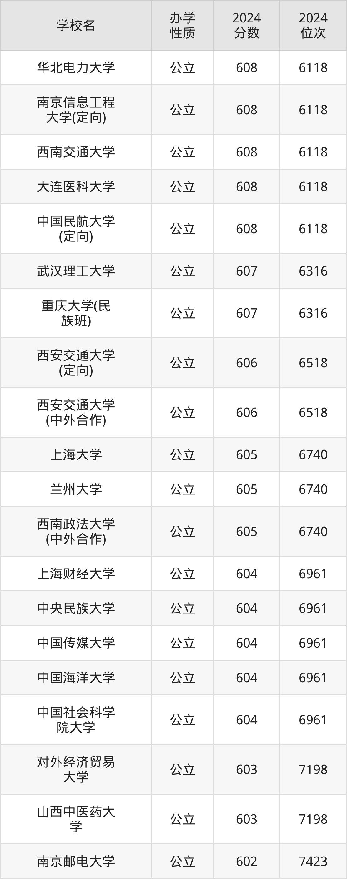 云南603分左右的考生可以上华北电力大学、南京信息工程大学(定向)、西南交通大学等院校,刚好在603分的院校有对外经济贸易大学、山西中医药大学。