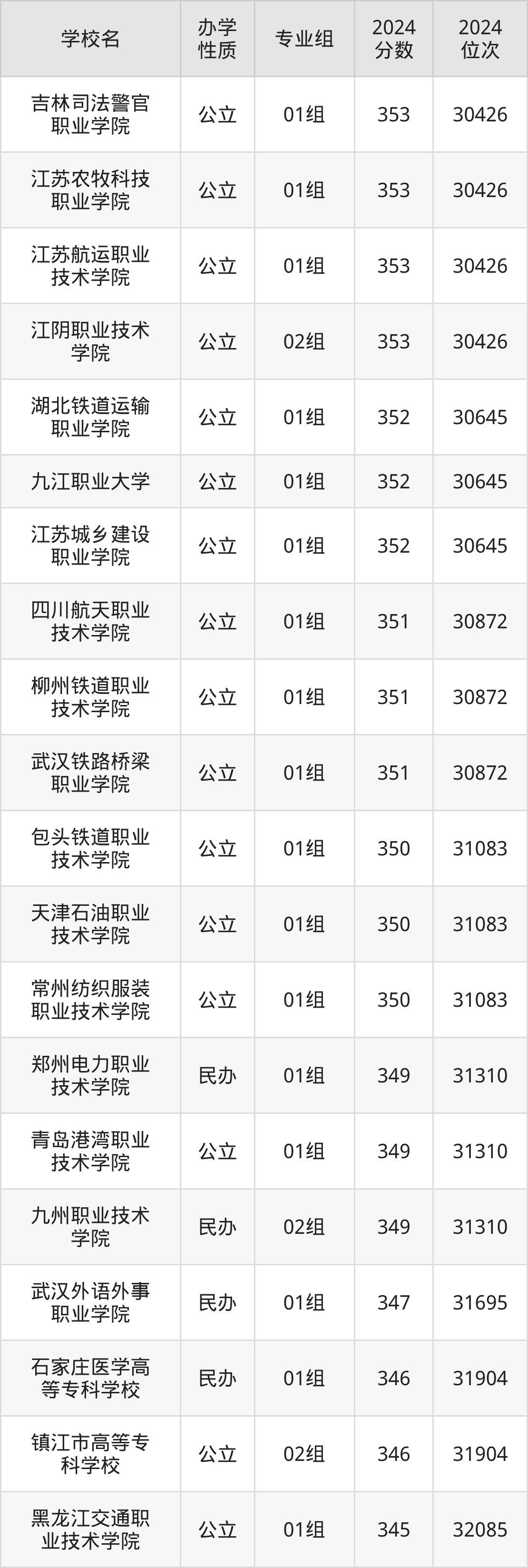| 吉林司法警官 职业学院 | 01组 | 353 | 30426 |