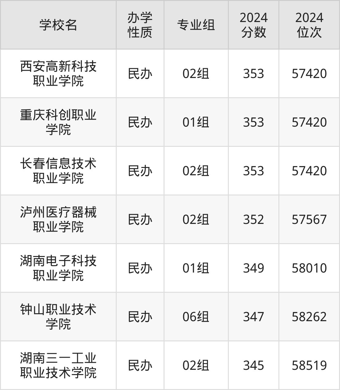 2024年江苏物理类349分考生能上西安高新科技职业学院、重庆科创职业学院、长春信息技术职业学院、泸州医疗器械职业学院、湖南电子科技职业学院等7所专科院校,具体录取分数线及位次为:
