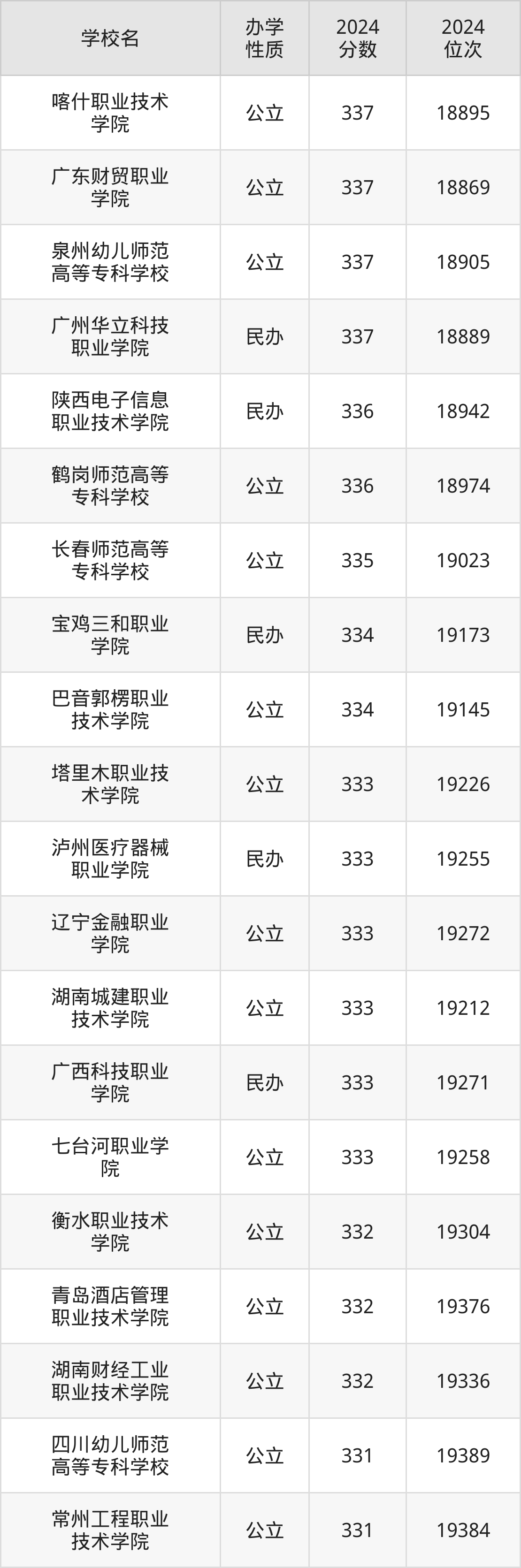 2024年宁夏文科332分考生能上喀什职业技术学院、广东财贸职业学院、泉州幼儿师范高等专科学校、广州华立科技职业学院、陕西电子信息职业技术学院等37所专科院校,具体录取分数线及位次为: