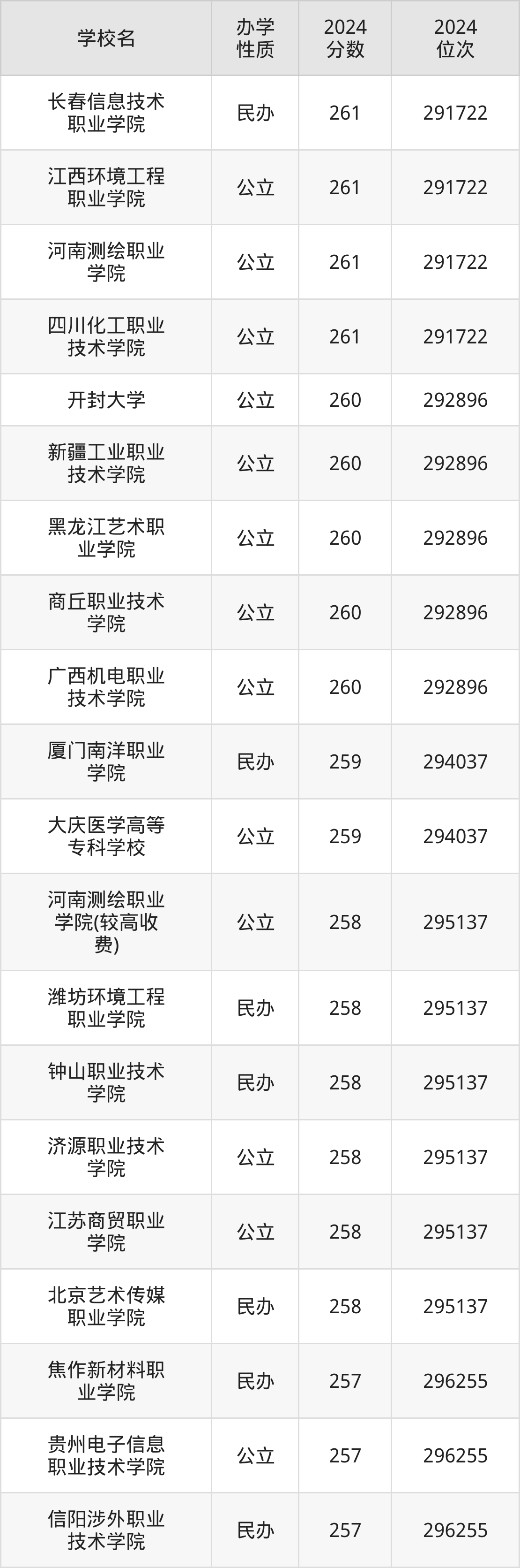 2024年河南文科256分考生能上长春信息技术职业学院、江西环境工程职业学院、河南测绘职业学院、四川化工职业技术学院、开封大学等43所专科院校,具体录取分数线及位次为: