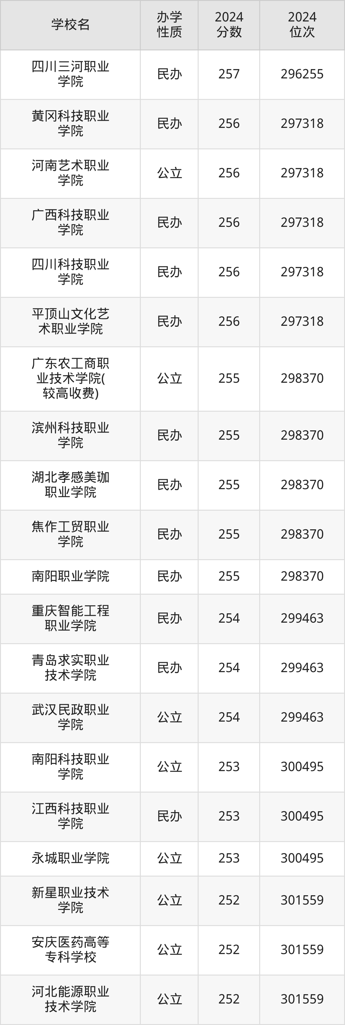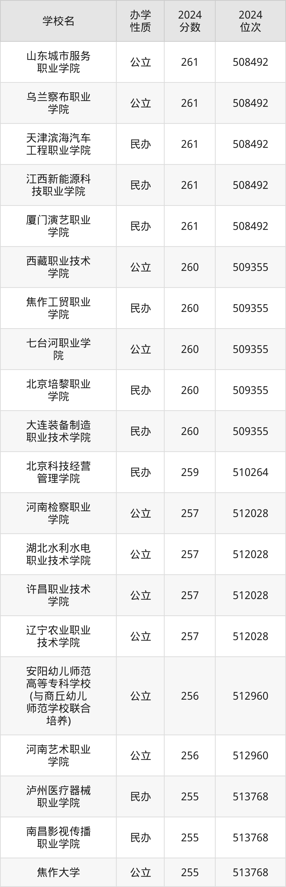 2024年河南理科256分考生能上山东城市服务职业学院、乌兰察布职业学院、天津滨海汽车工程职业学院、江西新能源科技职业学院、厦门演艺职业学院等34所专科院校,具体录取分数线及位次为: