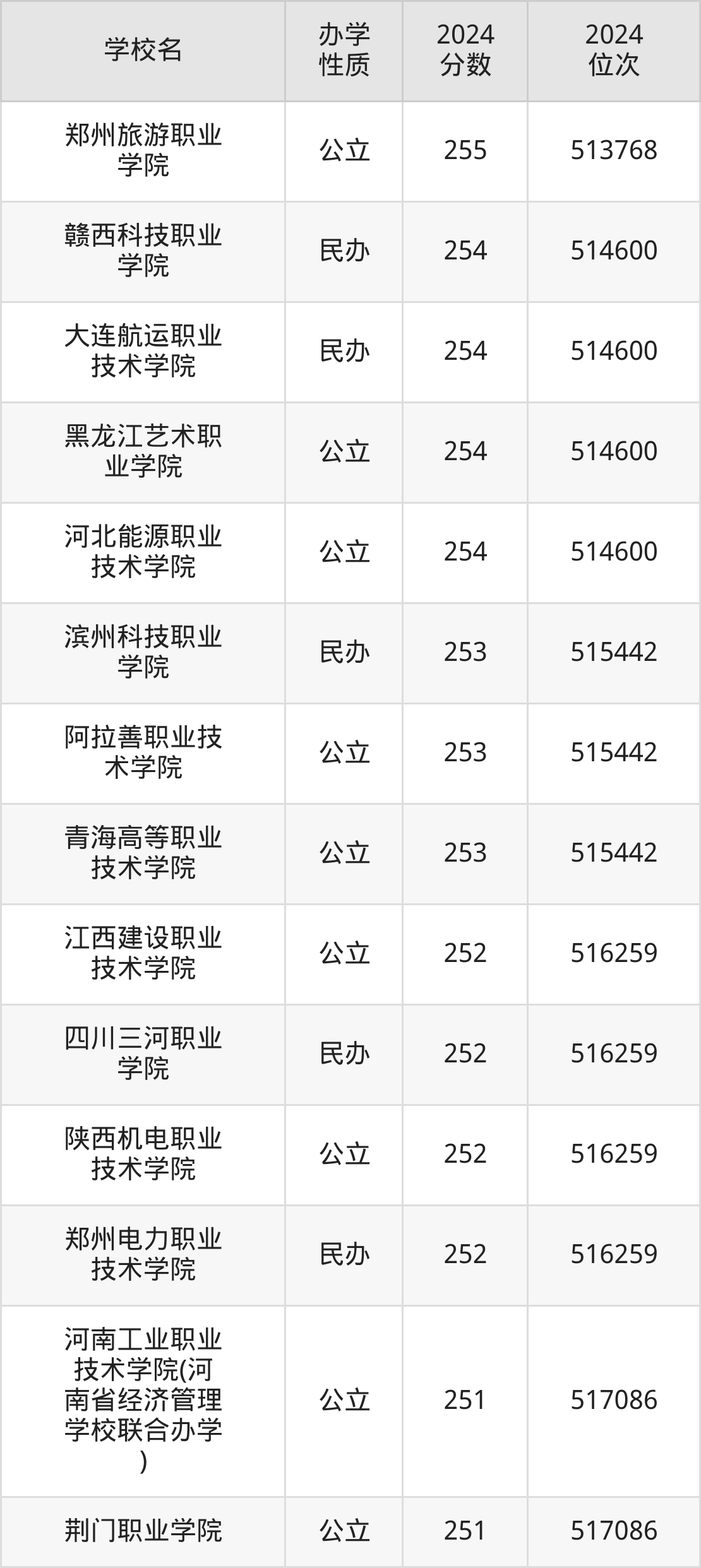 | 郑州旅游职业 学院 | 255 | 513768 |