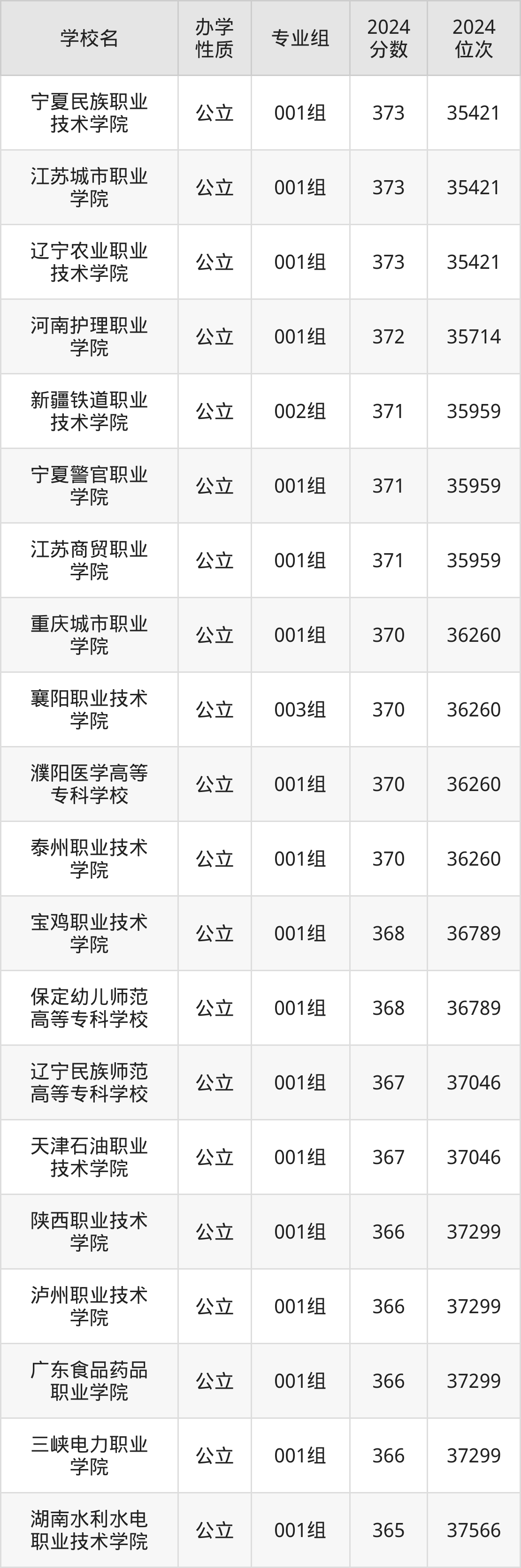 2024年甘肃历史类368分考生能上宁夏民族职业技术学院、江苏城市职业学院、辽宁农业职业技术学院、河南护理职业学院、新疆铁道职业技术学院等23所专科院校,具体录取分数线及位次为: