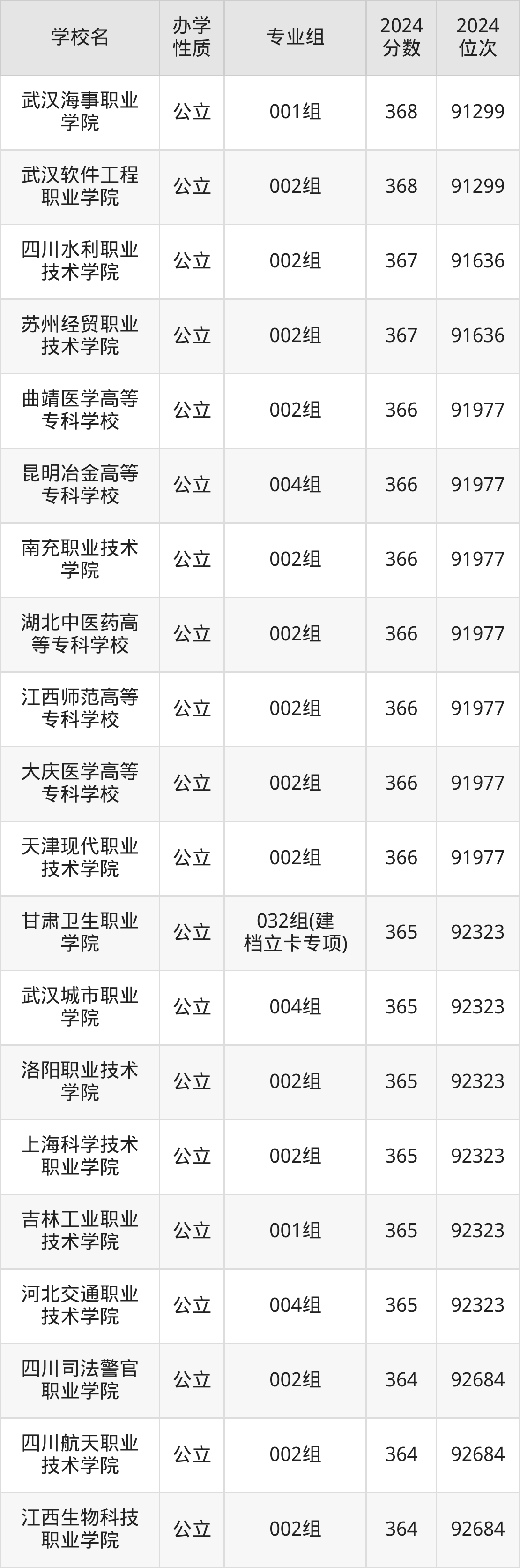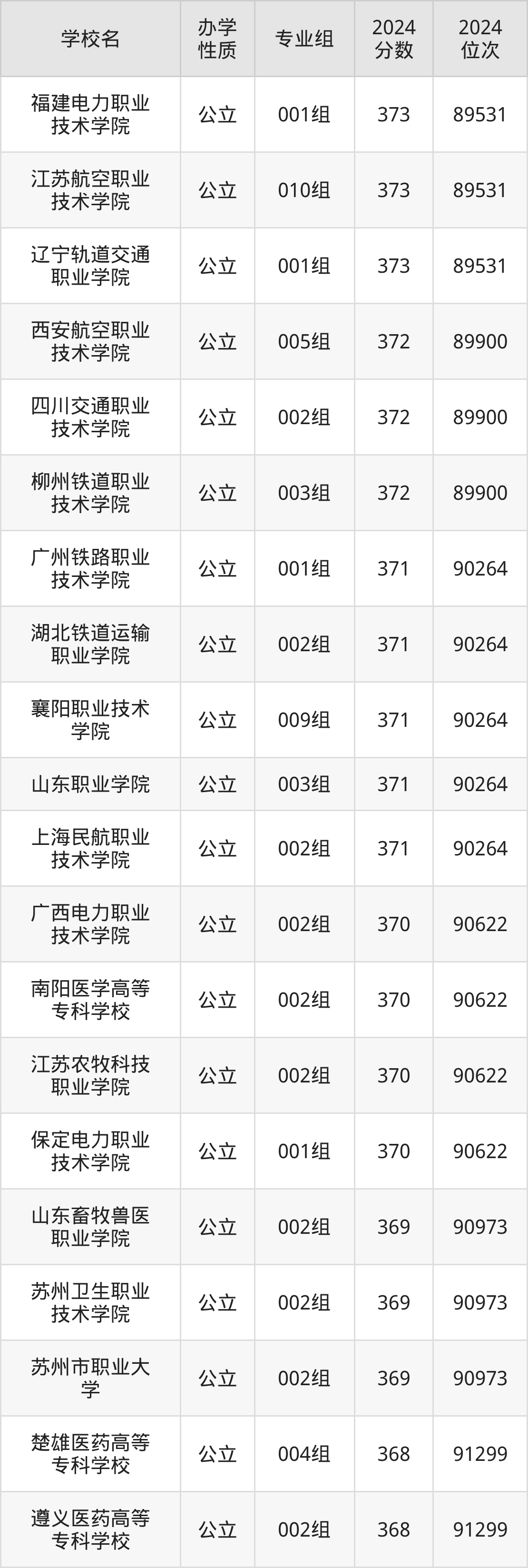 2024年甘肃物理类368分考生能上福建电力职业技术学院、江苏航空职业技术学院、辽宁轨道交通职业学院、西安航空职业技术学院、四川交通职业技术学院等45所专科院校,具体录取分数线及位次为: