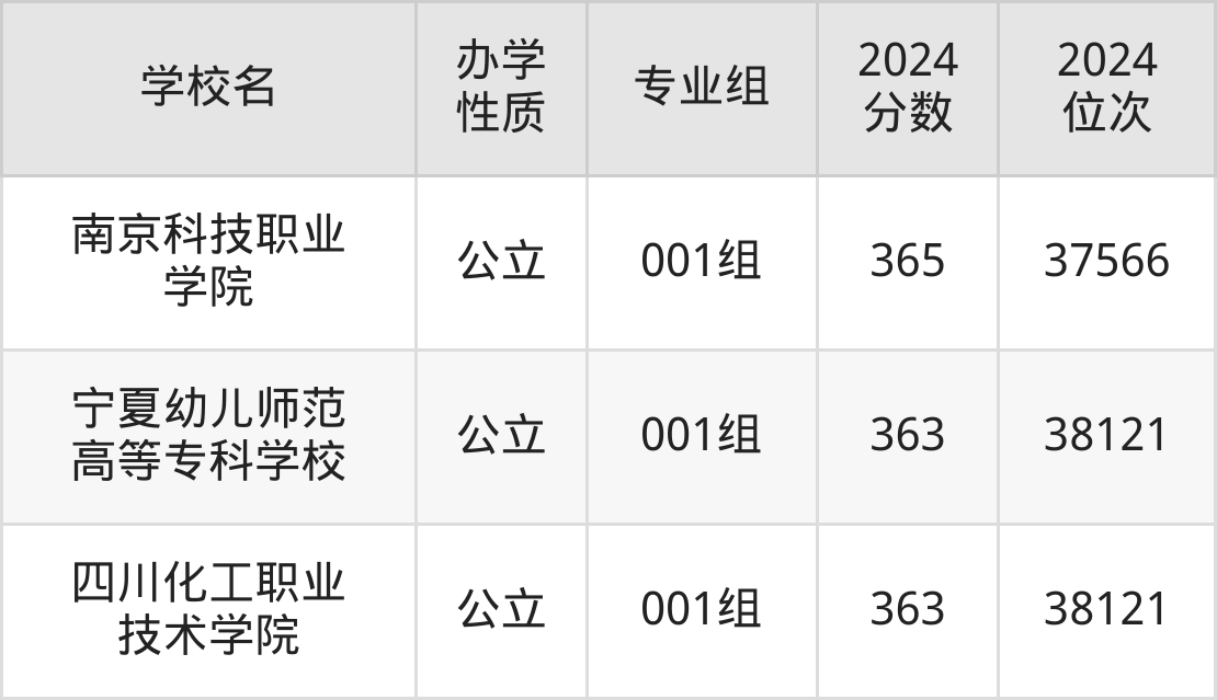 | 宁夏幼儿师范 高等专科学校 | 001组 | 363 | 38121 |