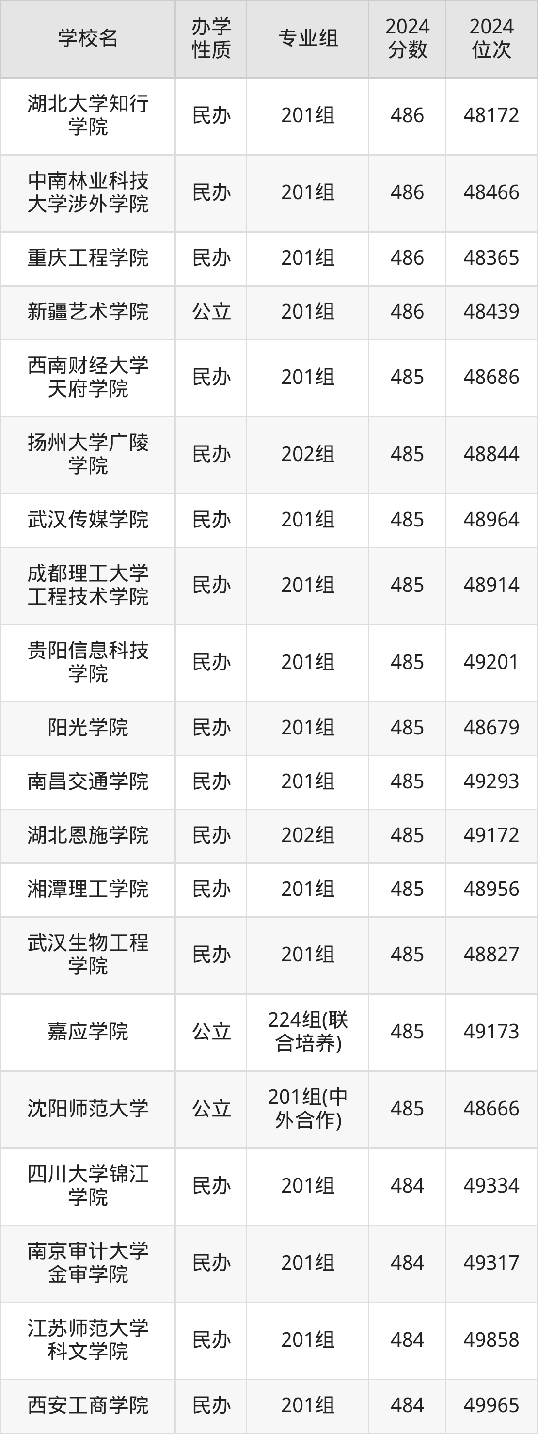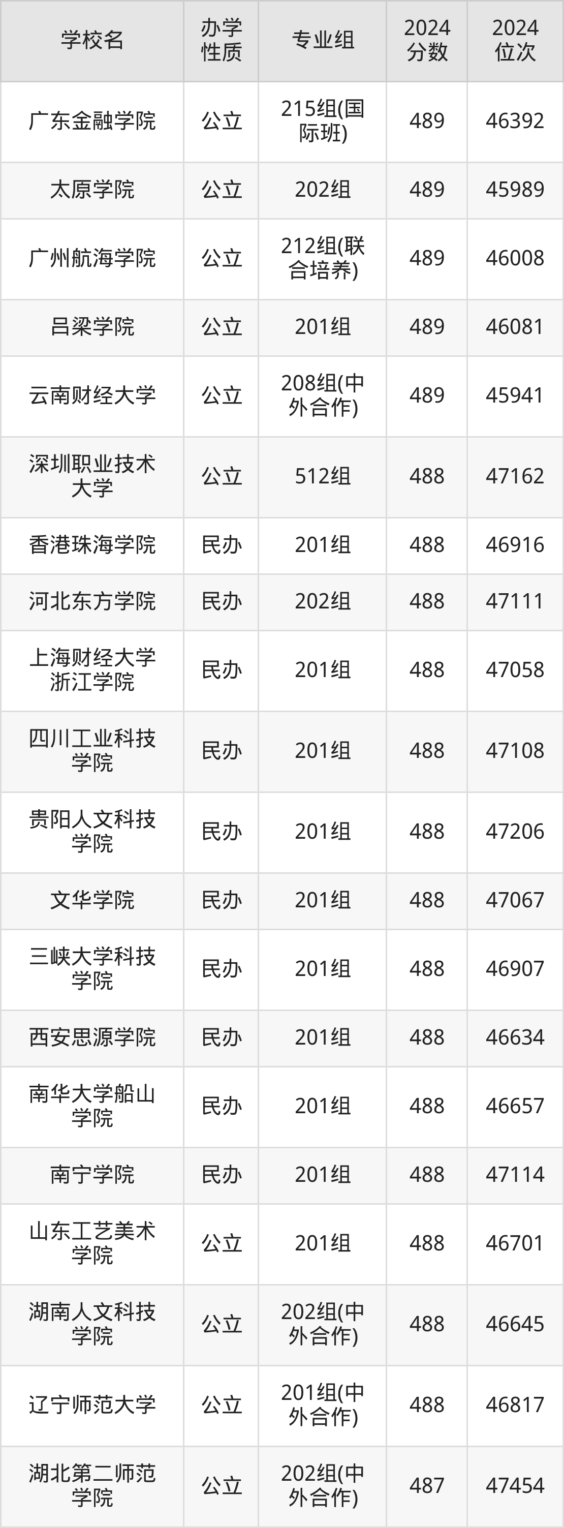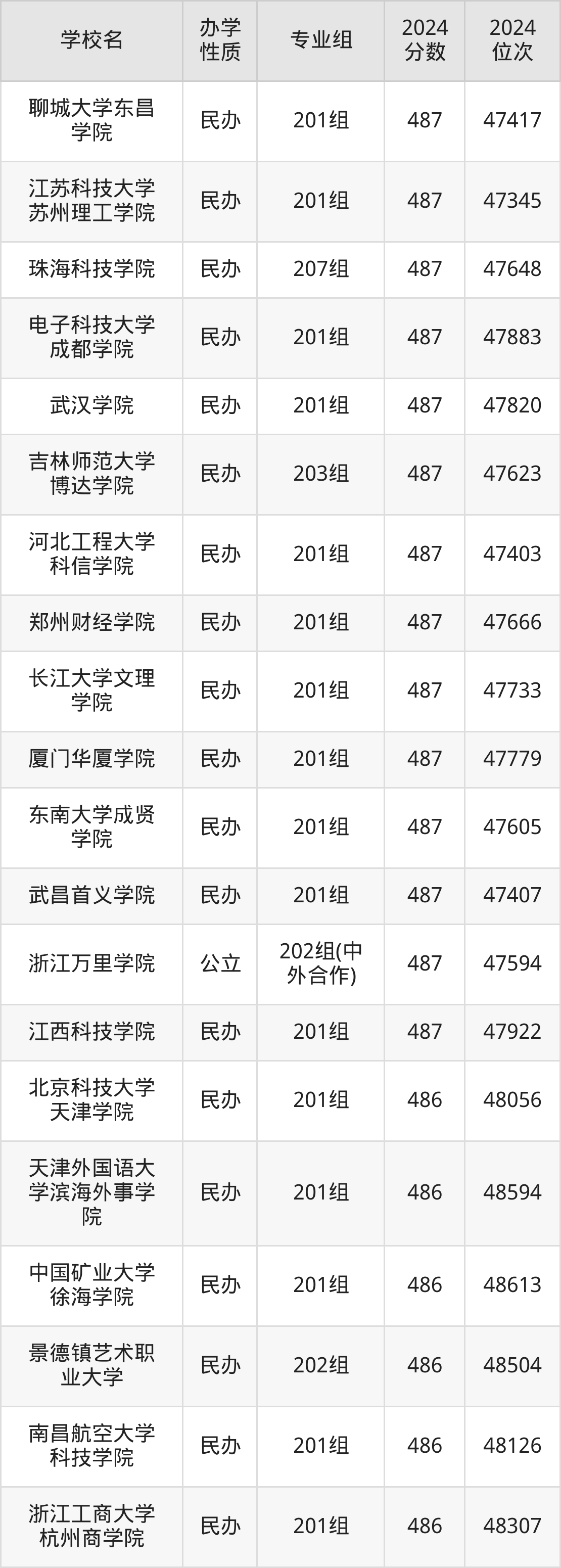| 浙大宁波理工 学院 | 201组(中 外合作) | 489 | 46548 |