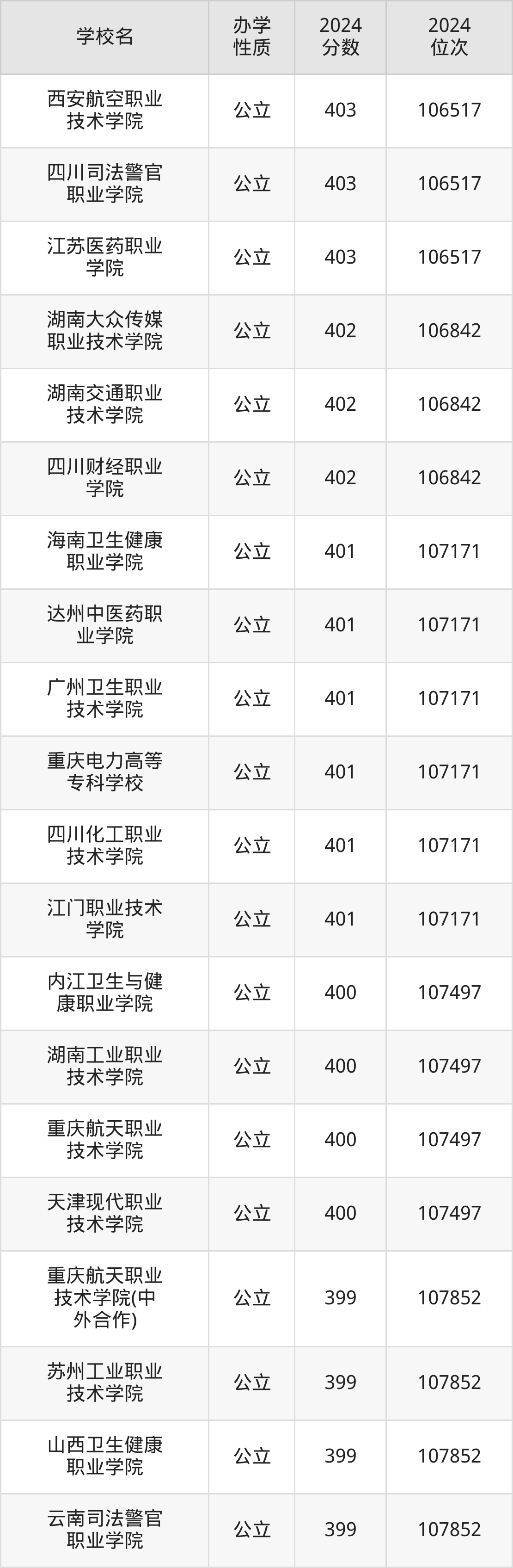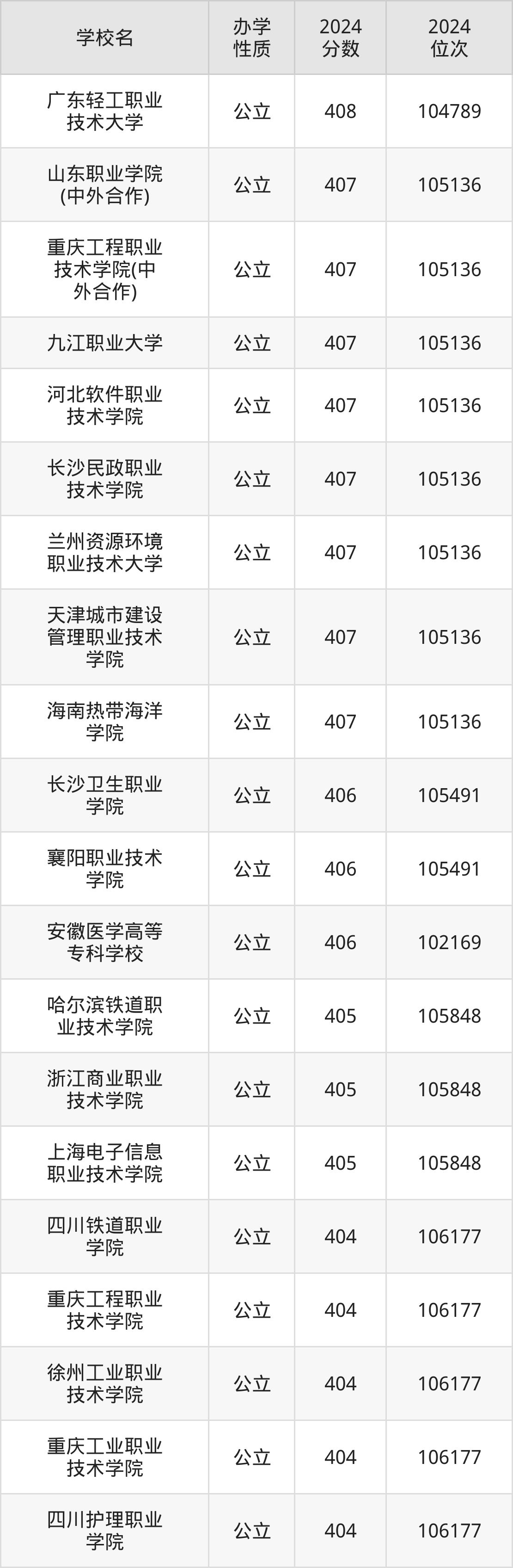 重庆403分左右的考生可以上广东轻工职业技术大学、山东职业学院(中外合作)、重庆工程职业技术学院(中外合作)等院校,刚好在403分的院校有西安航空职业技术学院、四川司法警官职业学院、江苏医药职业学院。