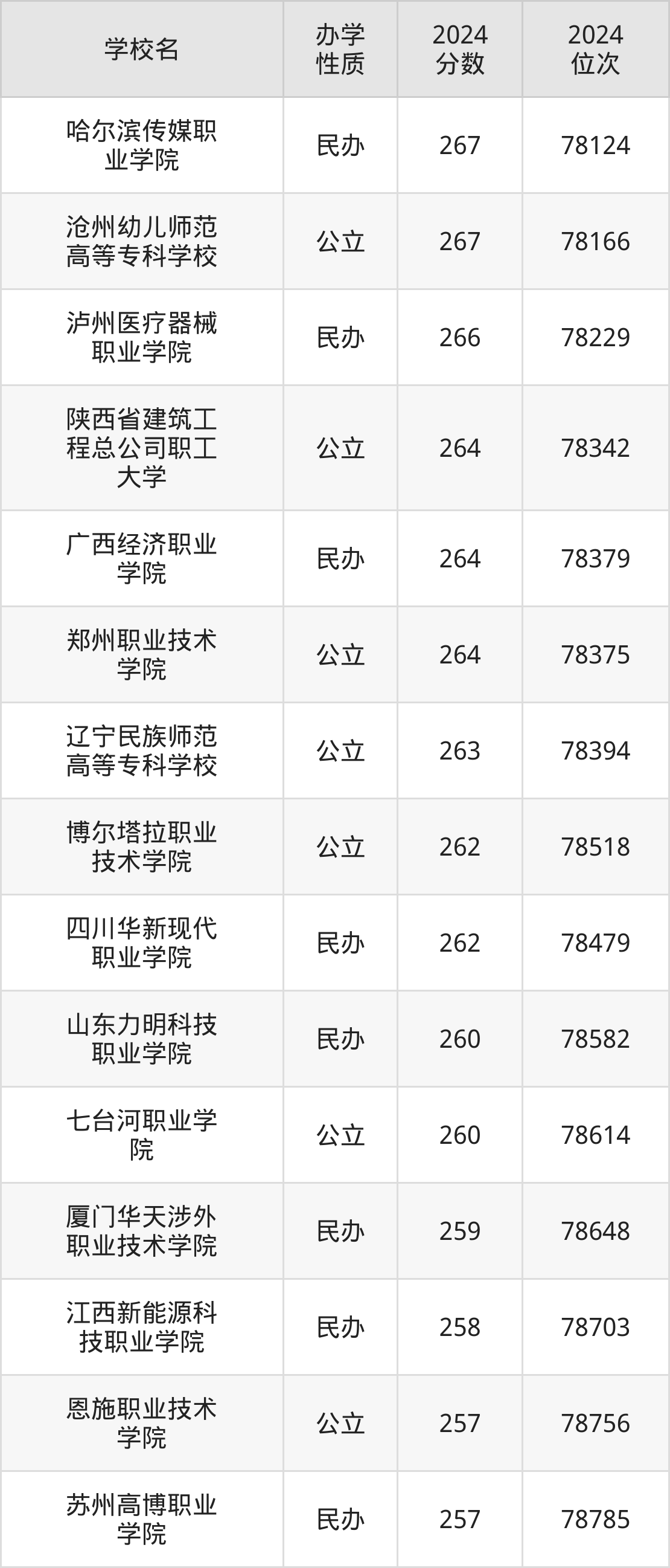 2024年陕西文科262分考生能上哈尔滨传媒职业学院、沧州幼儿师范高等专科学校、泸州医疗器械职业学院、陕西省建筑工程总公司职工大学、广西经济职业学院等15所专科院校,具体录取分数线及位次为: