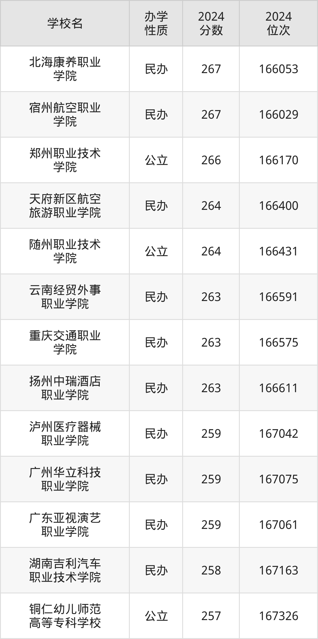 2024年陕西理科262分考生能上北海康养职业学院、宿州航空职业学院、郑州职业技术学院、天府新区航空旅游职业学院、随州职业技术学院等13所专科院校,具体录取分数线及位次为: