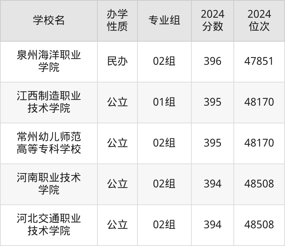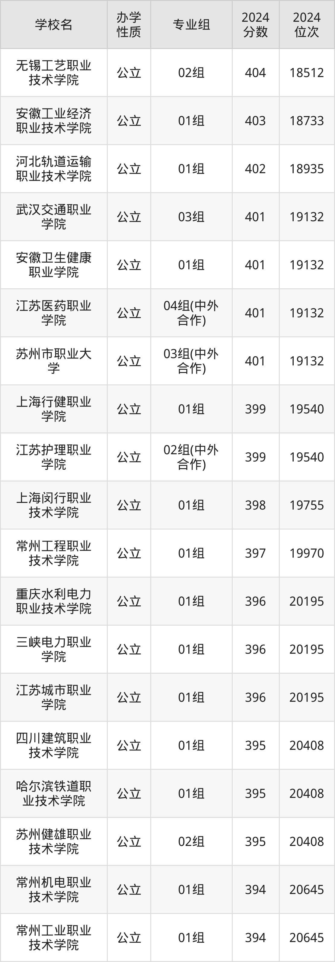 2024年江苏历史类399分考生能上无锡工艺职业技术学院、安徽工业经济职业技术学院、河北轨道运输职业技术学院、武汉交通职业学院、安徽卫生健康职业学院等19所专科院校,具体录取分数线及位次为: