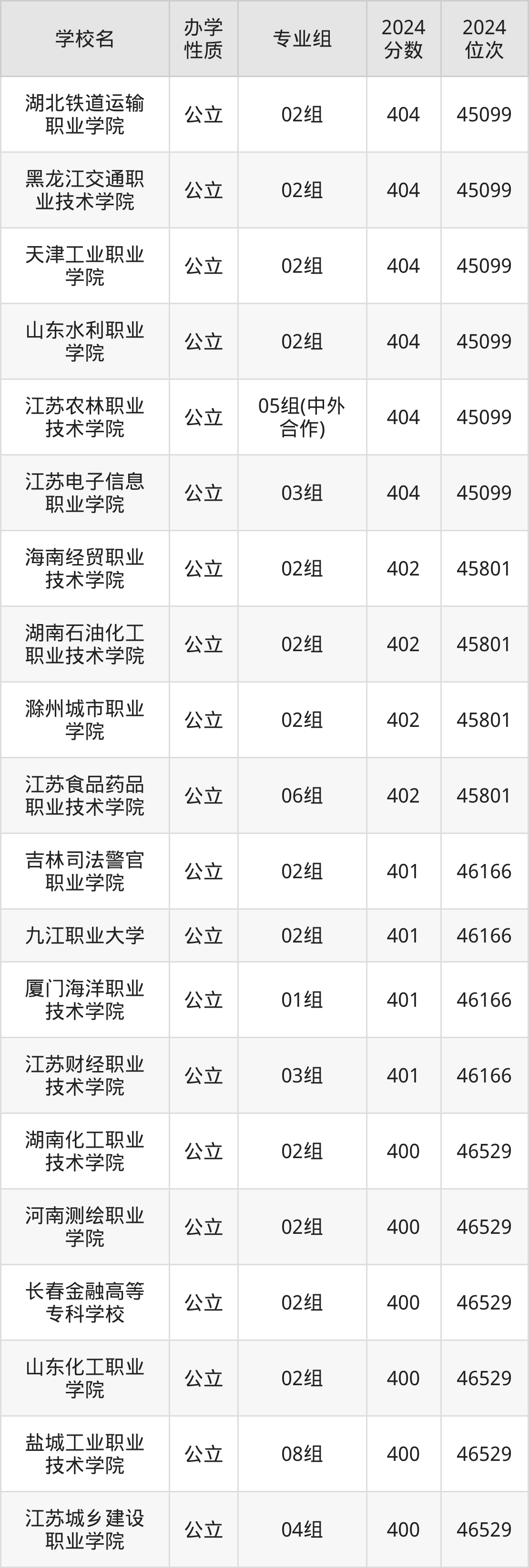 2024年江苏物理类399分考生能上湖北铁道运输职业学院、黑龙江交通职业技术学院、天津工业职业学院、山东水利职业学院、江苏农林职业技术学院等45所专科院校,具体录取分数线及位次为: