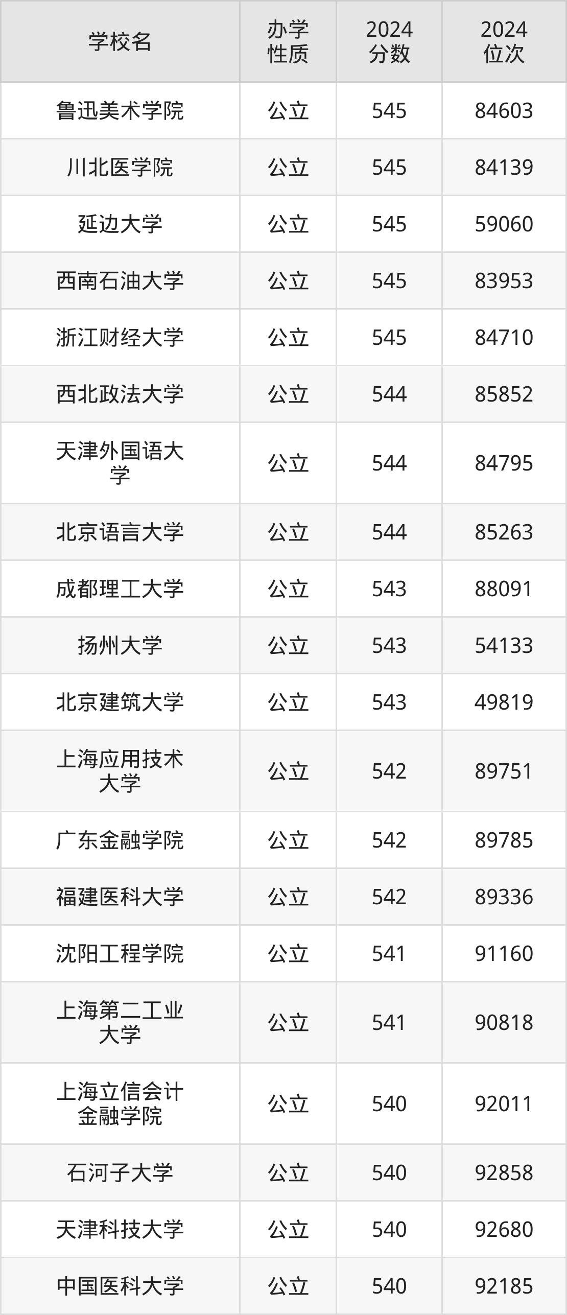 2024年山东540分考生能上鲁迅美术学院、川北医学院、延边大学、西南石油大学、浙江财经大学等32所一本院校,具体录取分数线及位次为: