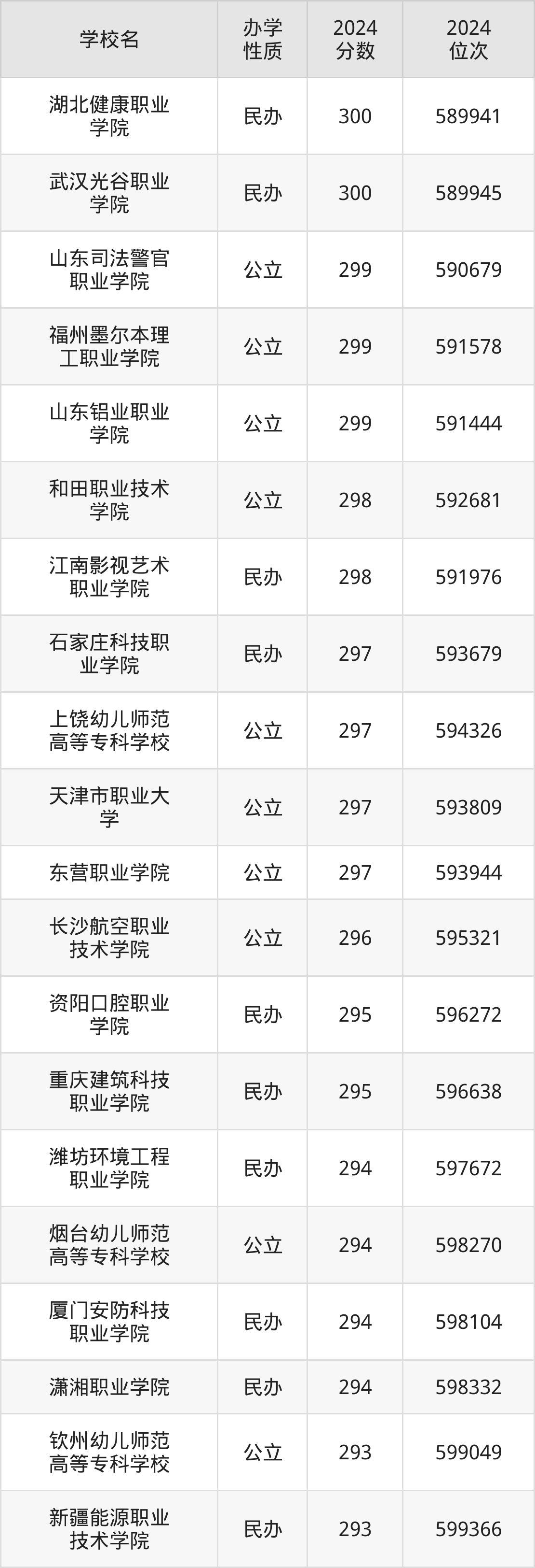 2024年山东295分考生能上湖北健康职业学院、武汉光谷职业学院、山东司法警官职业学院、福州墨尔本理工职业学院、山东铝业职业学院等26所专科院校,具体录取分数线及位次为: