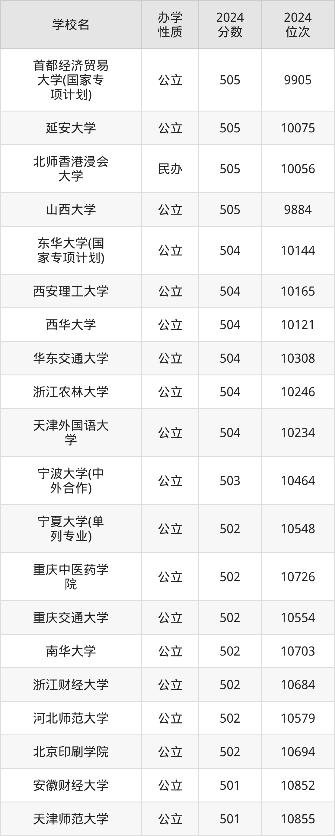 2024年陕西文科500分考生能上首都经济贸易大学(国家专项计划)、延安大学、北师香港浸会大学、山西大学、东华大学(国家专项计划)等35所一本院校,具体录取分数线及位次为: