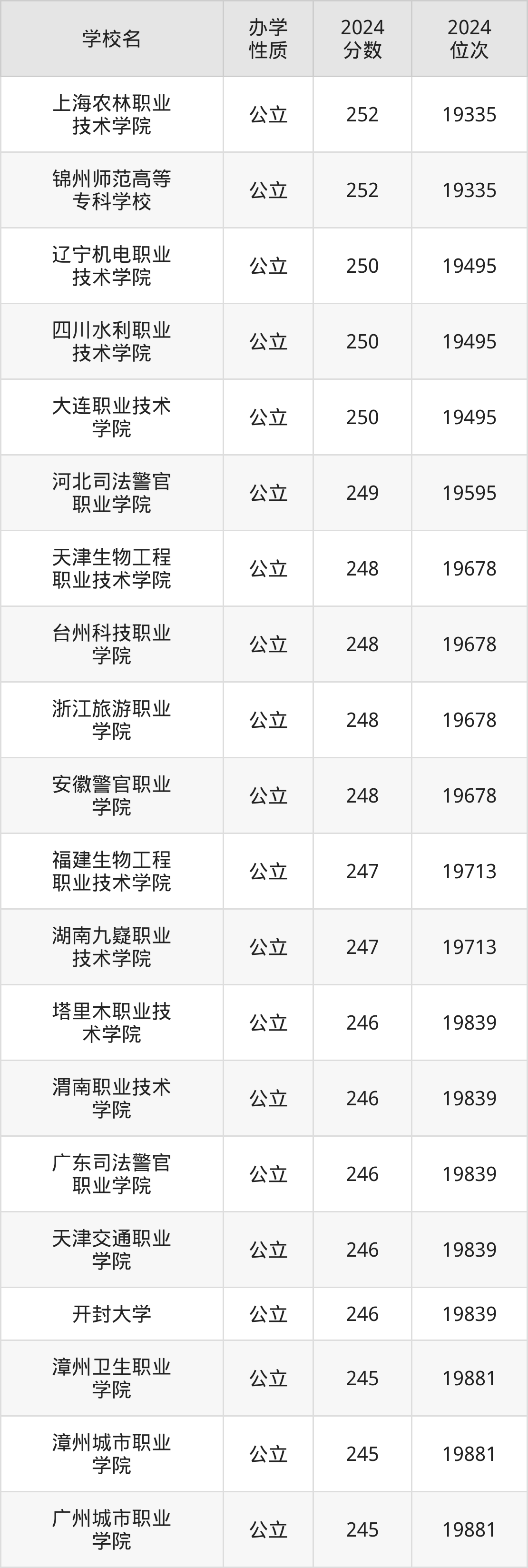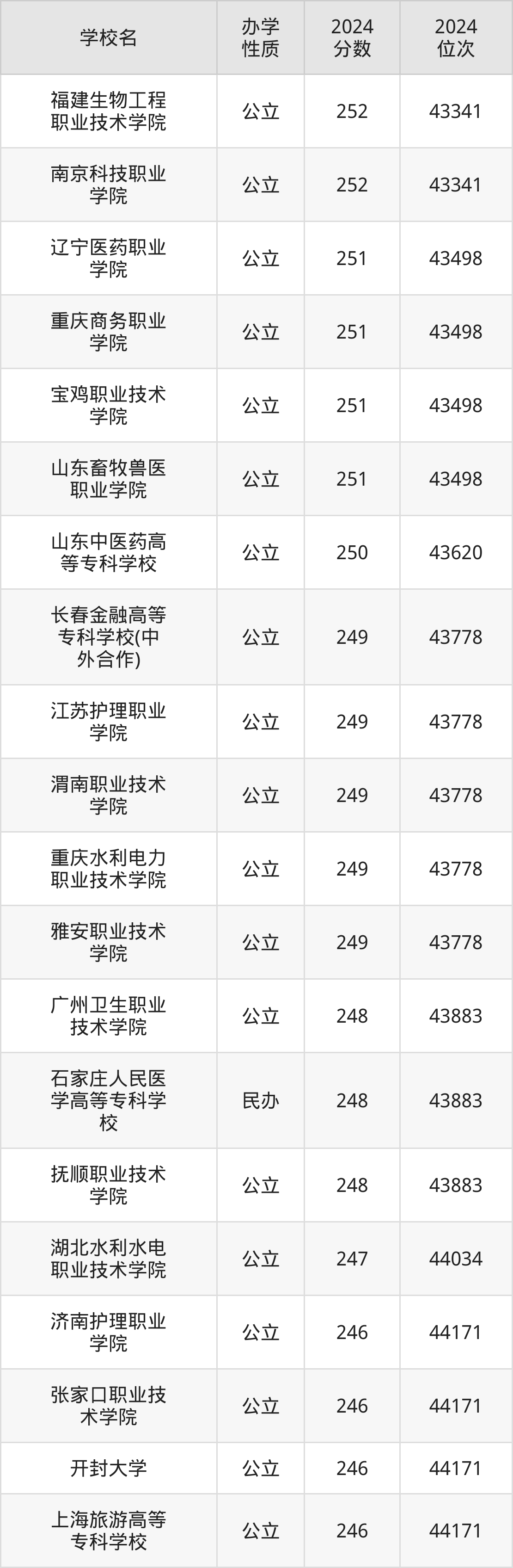 | 山东畜牧兽医 职业学院 | 251 | 43498 |