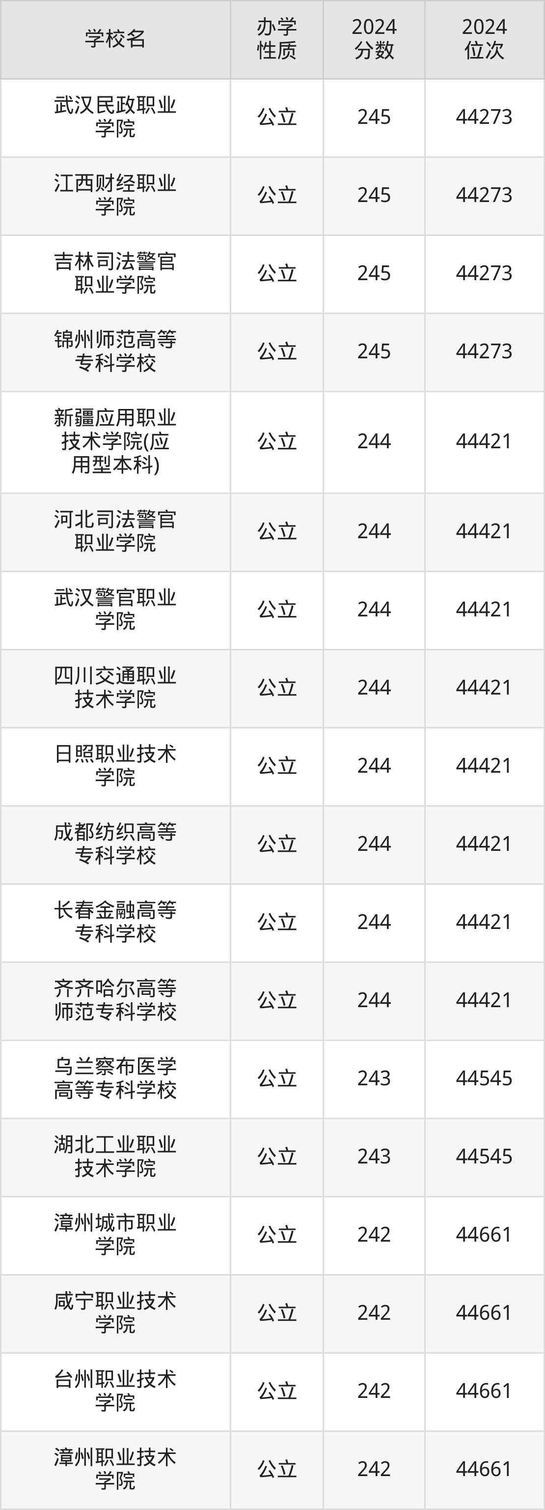 | 吉林司法警官 职业学院 | 245 | 44273 |