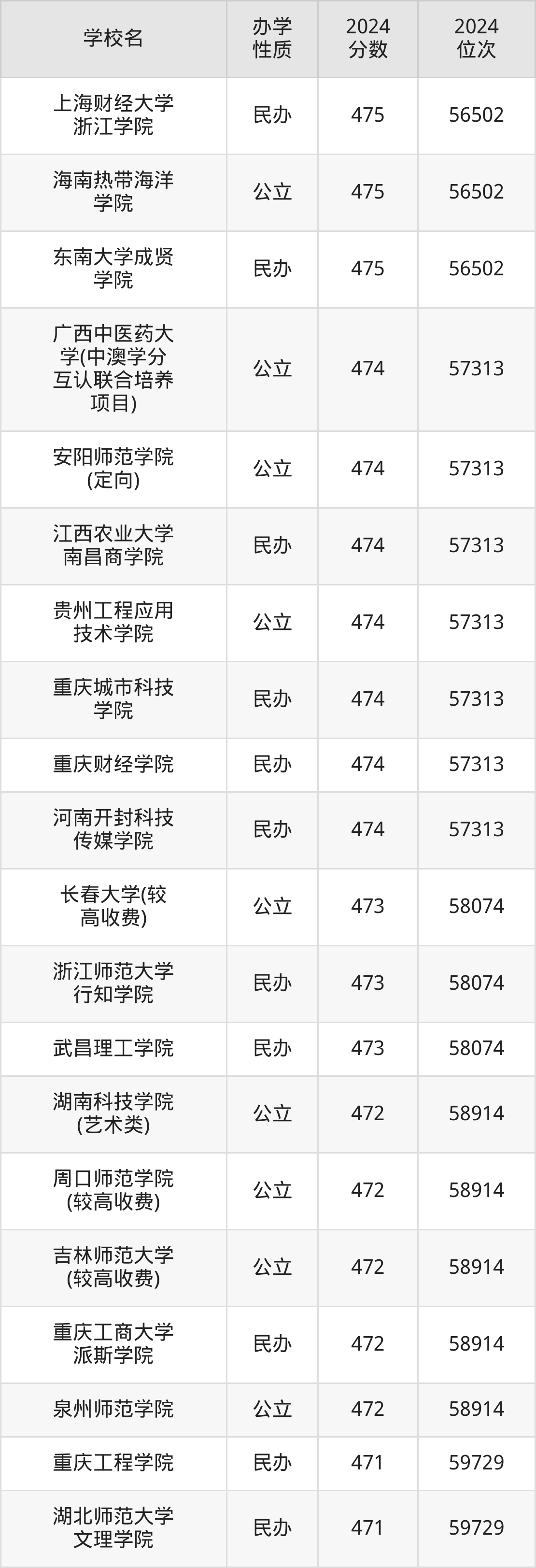 2024年河南文科471分考生能上成都体育学院(艺术类)、洛阳师范学院(定向)、吉林师范大学(中外合作和国际课程)、天水师范学院、浙江财经大学东方学院等68所二本院校,具体录取分数线及位次为: