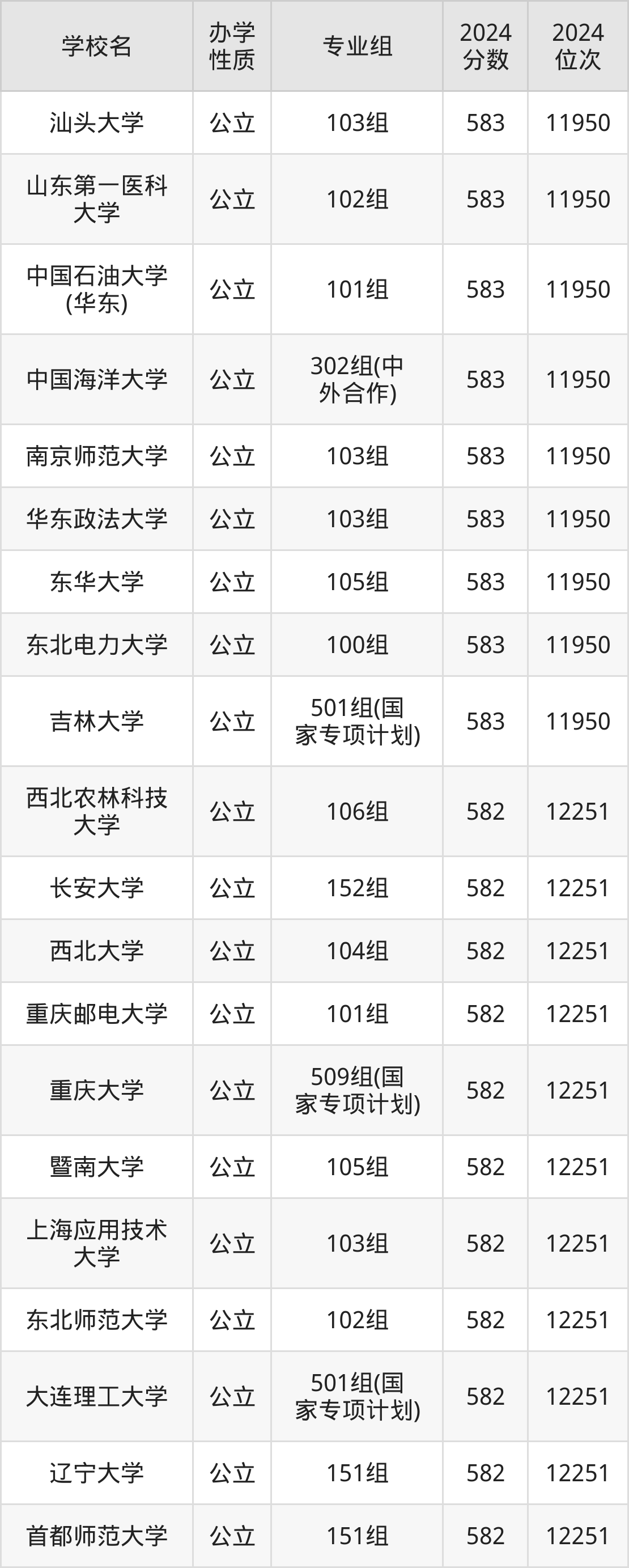 | 吉林大学 | 501组(国 家专项计划) | 583 | 11950 |