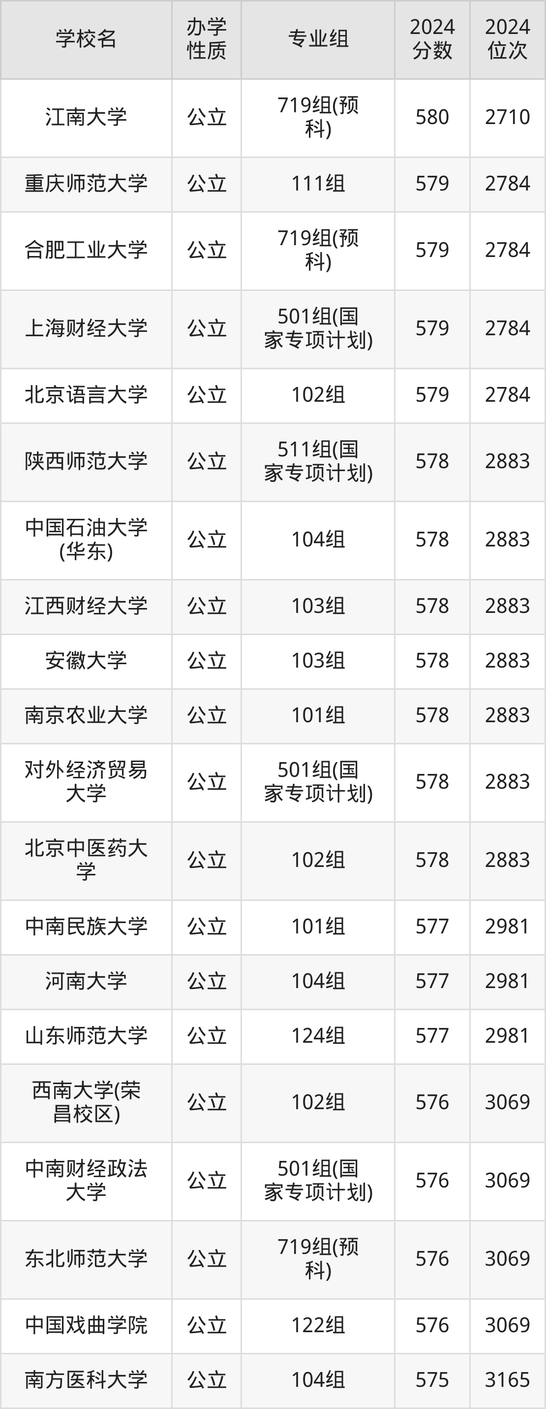 | 江南大学 | 719组(预 科) | 580 | 2710 |