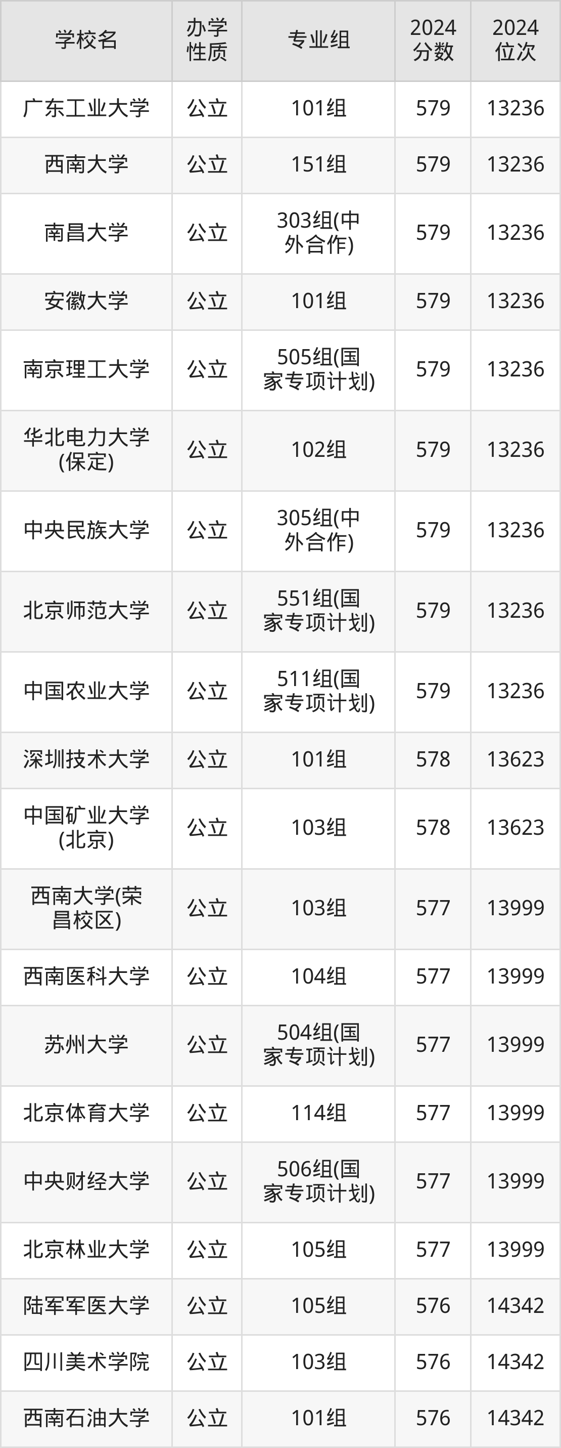 | 中央民族大学 | 305组(中 外合作) | 579 | 13236 |