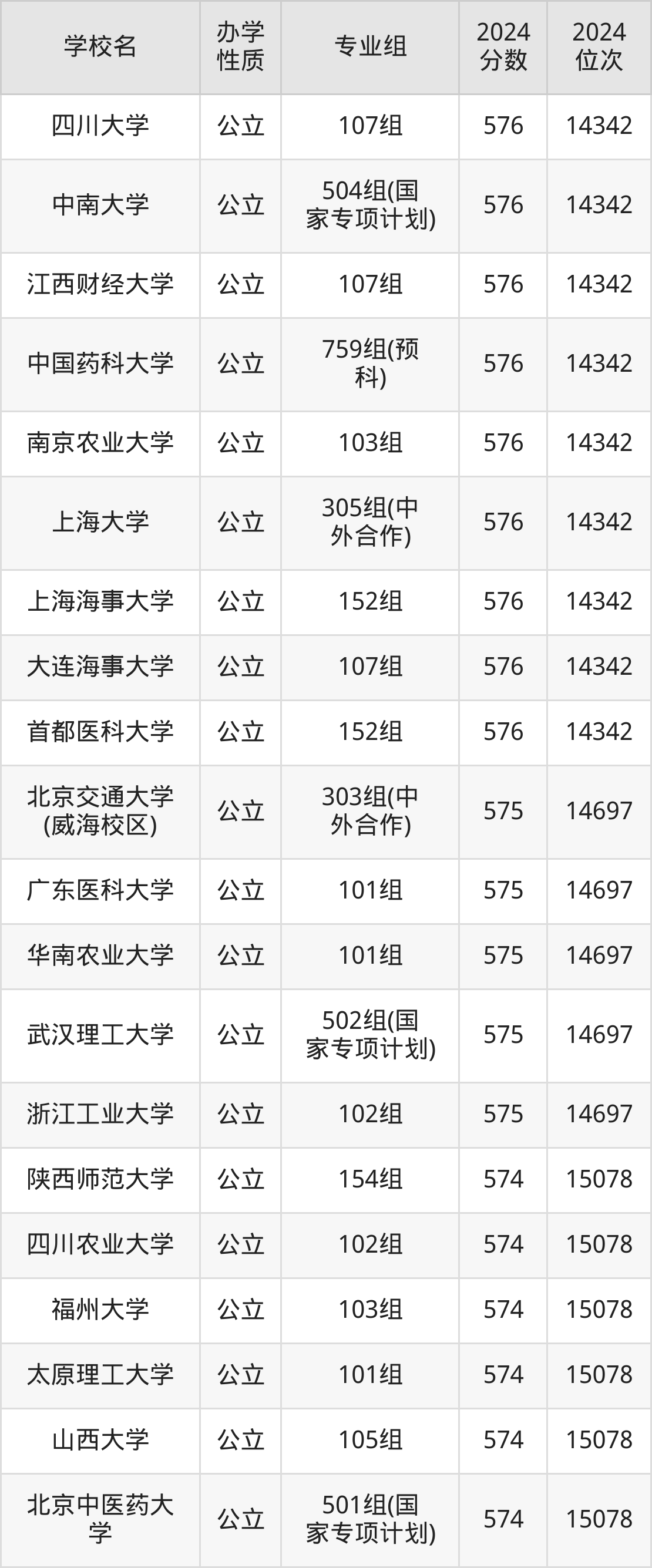 | 中国药科大学 | 759组(预 科) | 576 | 14342 |