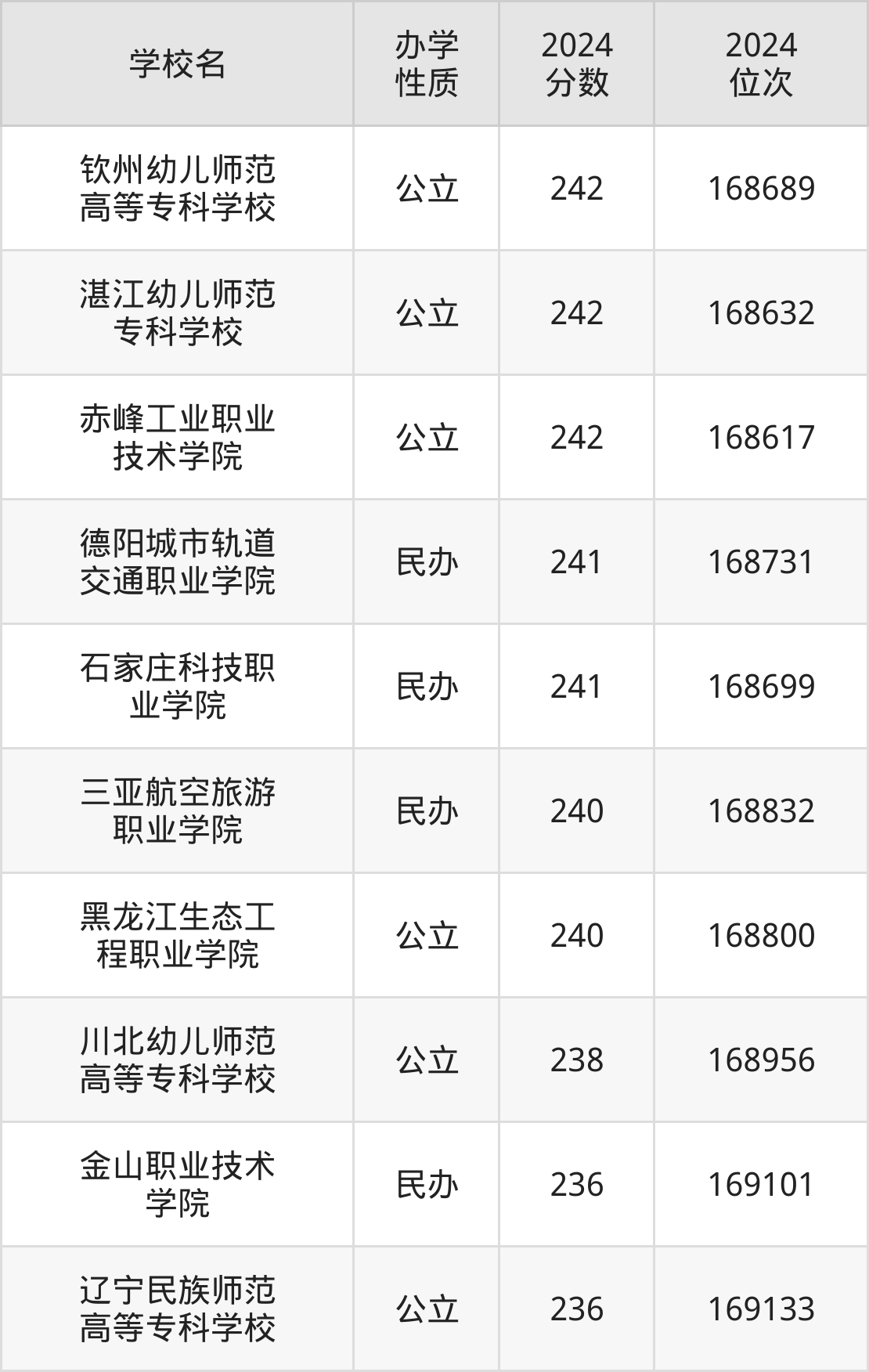 2024年陕西理科240分考生能上钦州幼儿师范高等专科学校、湛江幼儿师范专科学校、赤峰工业职业技术学院、德阳城市轨道交通职业学院、石家庄科技职业学院等10所专科院校,具体录取分数线及位次为: