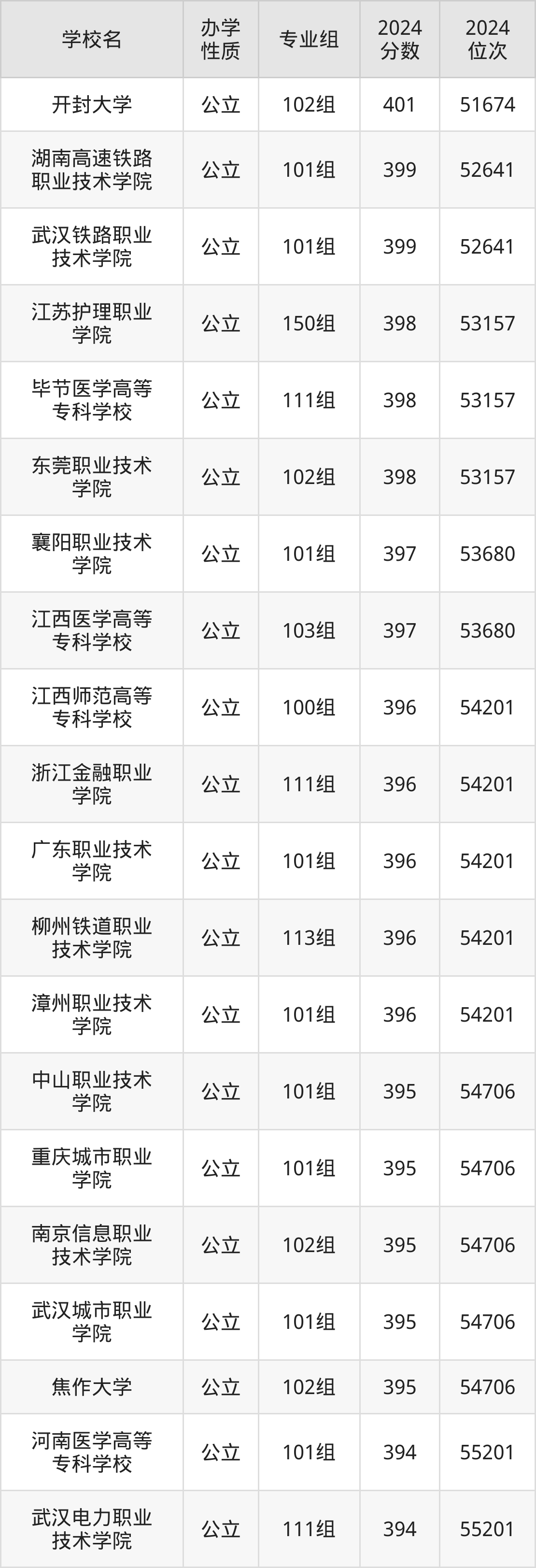 2024年广西历史类396分考生能上开封大学、湖南高速铁路职业技术学院、武汉铁路职业技术学院、江苏护理职业学院、毕节医学高等专科学校等29所专科院校,具体录取分数线及位次为: