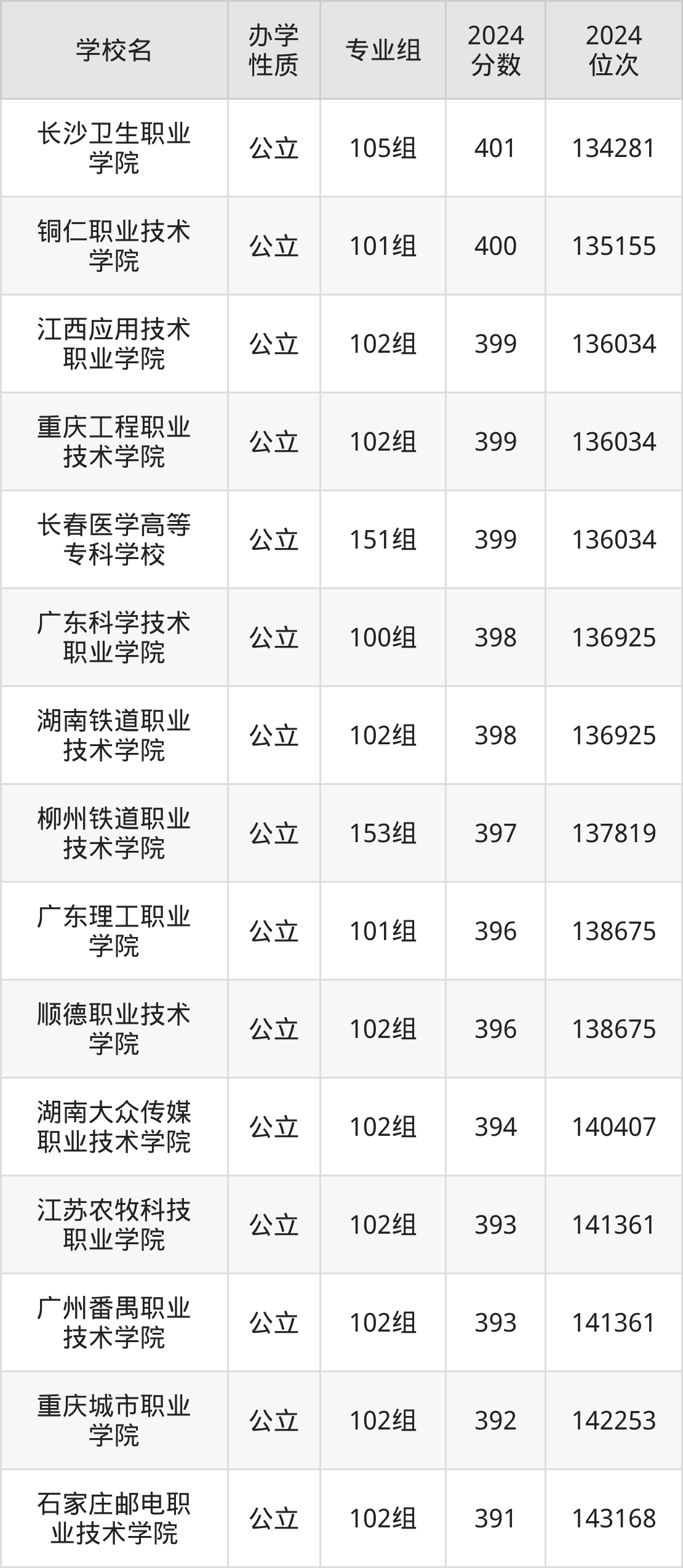 2024年广西物理类396分考生能上长沙卫生职业学院、铜仁职业技术学院、江西应用技术职业学院、重庆工程职业技术学院、长春医学高等专科学校等15所专科院校,具体录取分数线及位次为: