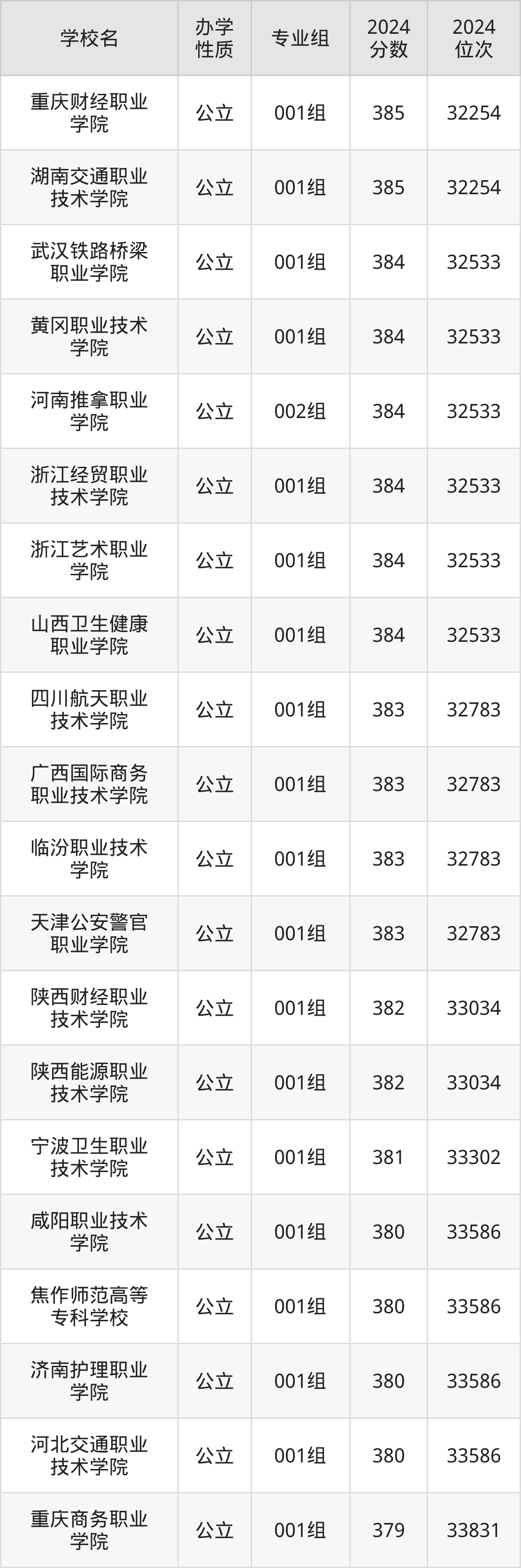 | 陕西财经职业 技术学院 | 001组 | 382 | 33034 |