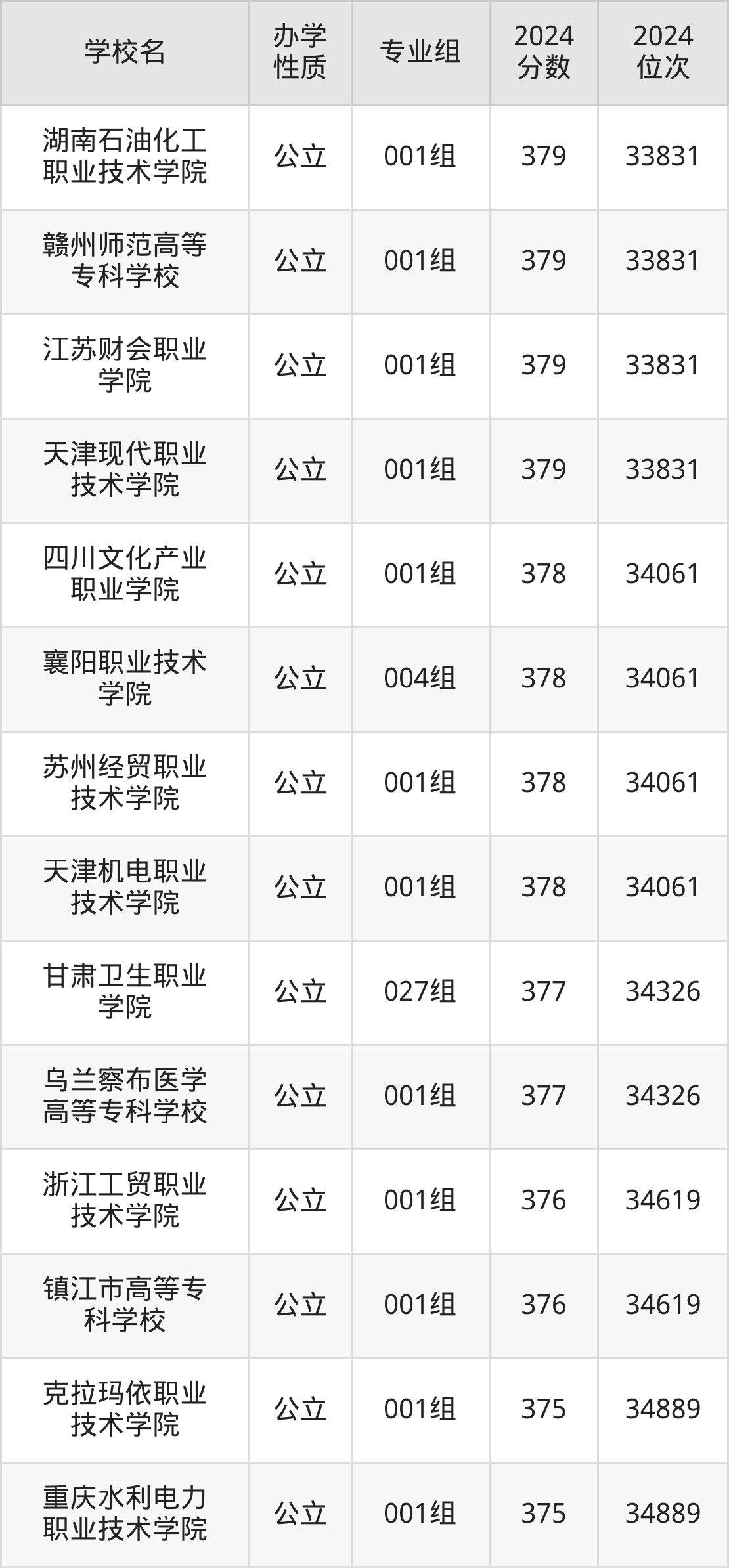 | 天津现代职业 技术学院 | 001组 | 379 | 33831 |