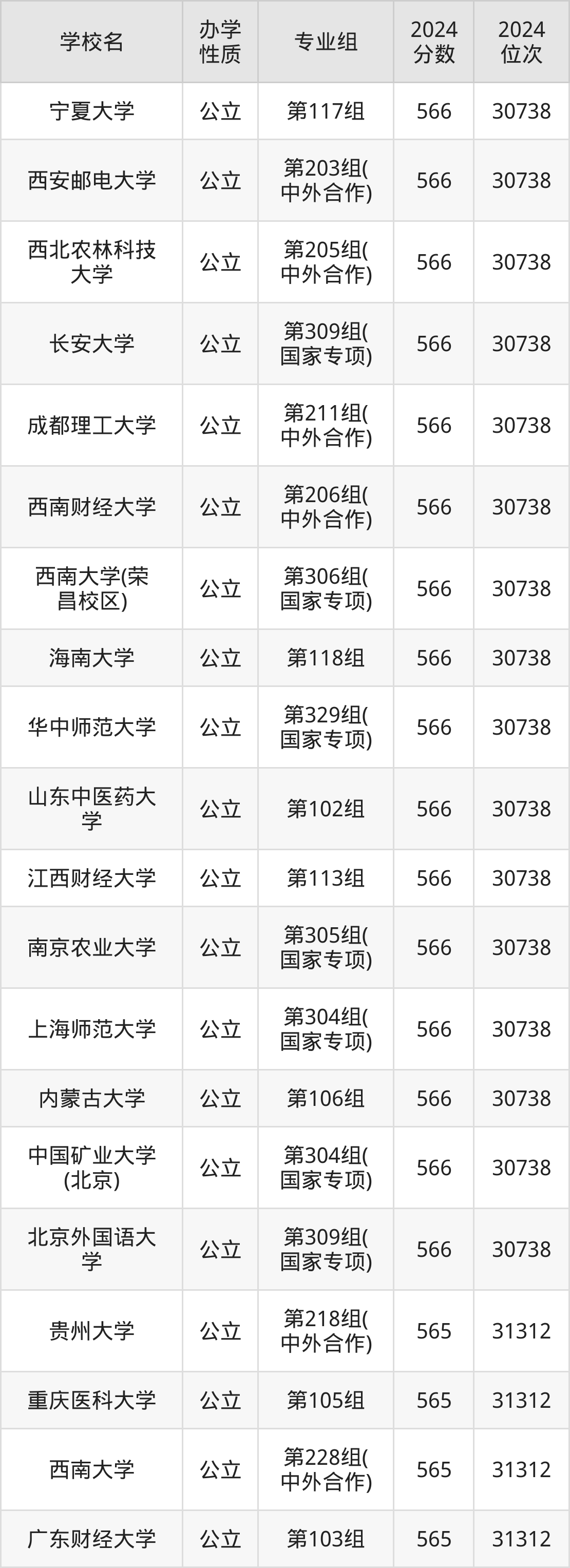 | 长安大学 | 第309组( 国家专项) | 566 | 30738 |
