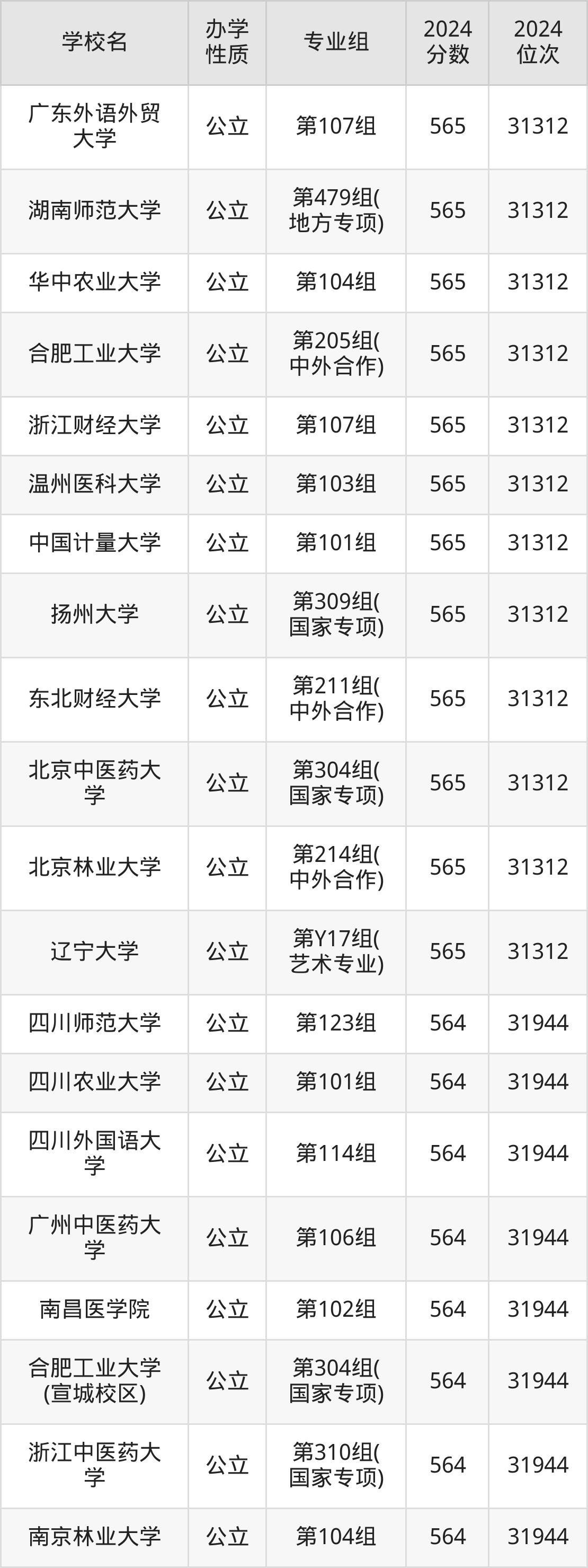 | 合肥工业大学 (宣城校区) | 第304组( 国家专项) | 564 | 31944 |