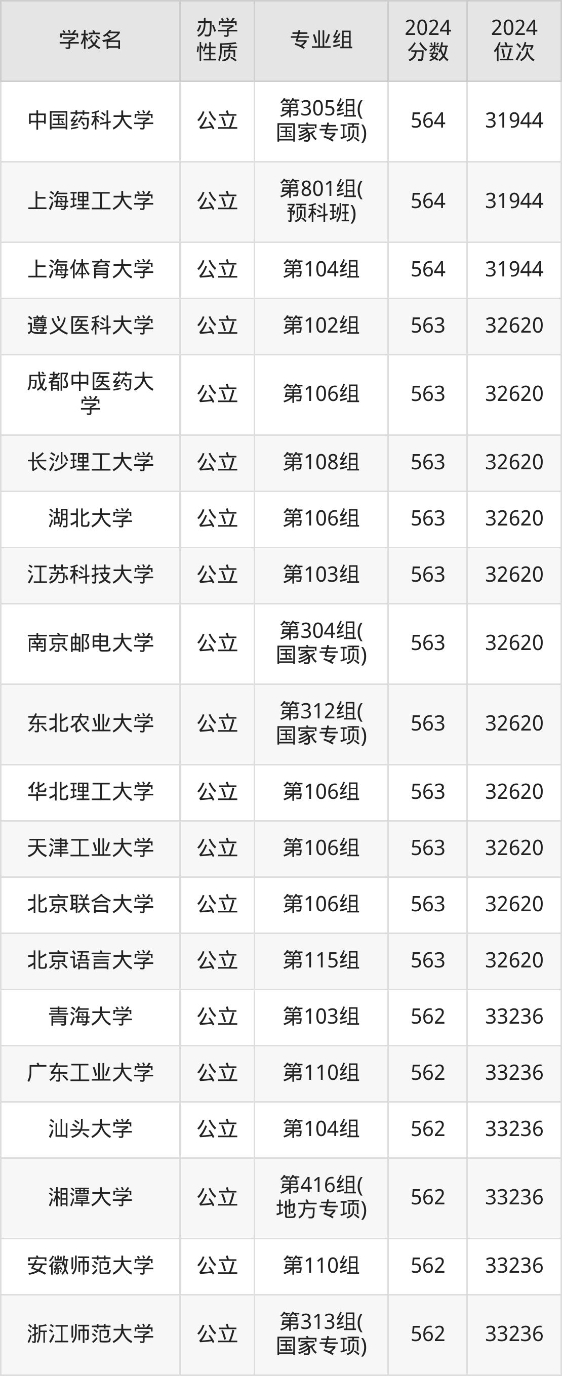 | 中国药科大学 | 第305组( 国家专项) | 564 | 31944 |