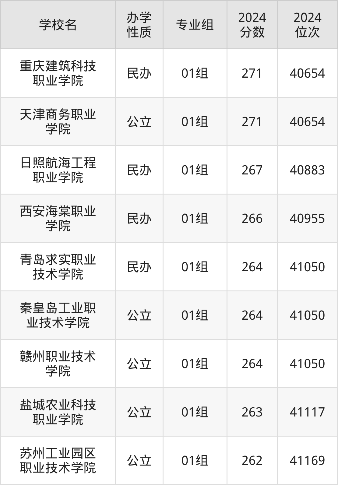 2024年江苏历史类266分考生能上重庆建筑科技职业学院、天津商务职业学院、日照航海工程职业学院、西安海棠职业学院、青岛求实职业技术学院等9所专科院校,具体录取分数线及位次为: