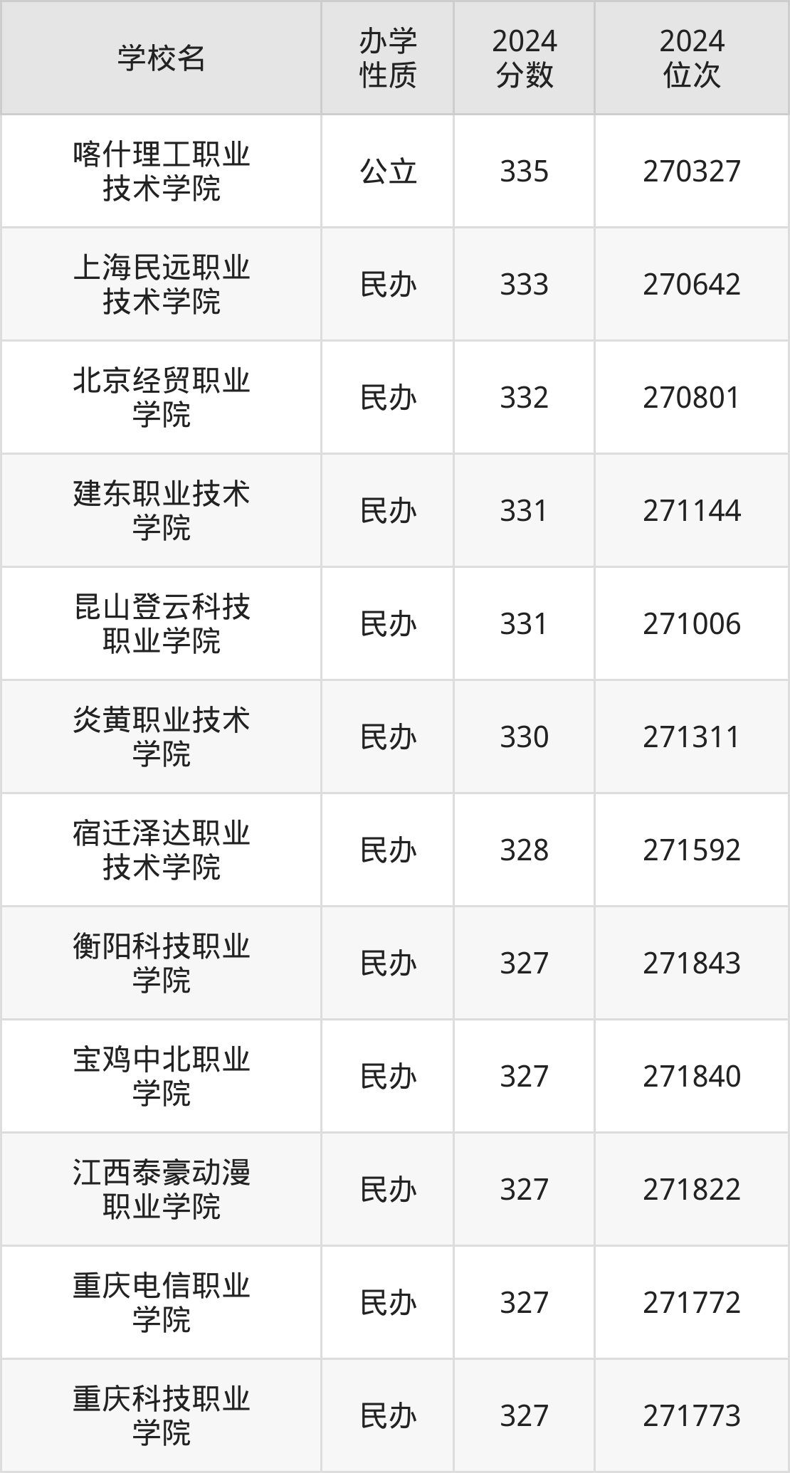 2024年浙江330分考生能上喀什理工职业技术学院、上海民远职业技术学院、北京经贸职业学院、建东职业技术学院、昆山登云科技职业学院等12所专科院校,具体录取分数线及位次为: