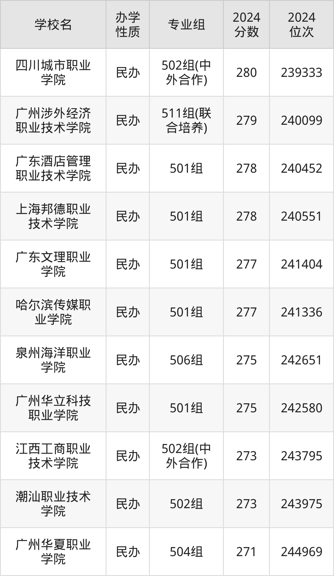 | 四川城市职业 学院 | 502组(中 外合作) | 280 | 239333 |