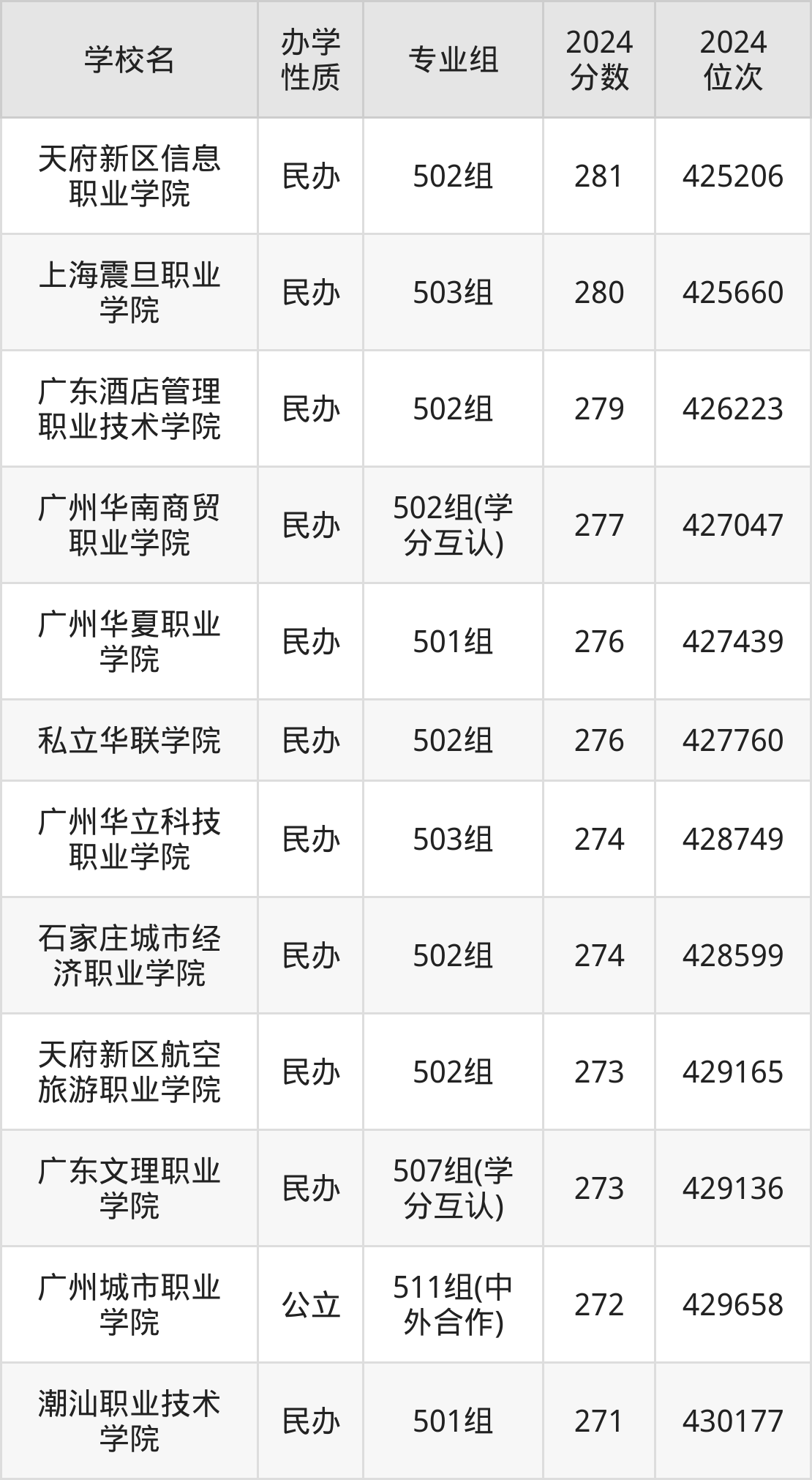 2024年广东物理类276分考生能上天府新区信息职业学院、上海震旦职业学院、广东酒店管理职业技术学院、广州华南商贸职业学院、广州华夏职业学院等12所专科院校,具体录取分数线及位次为: