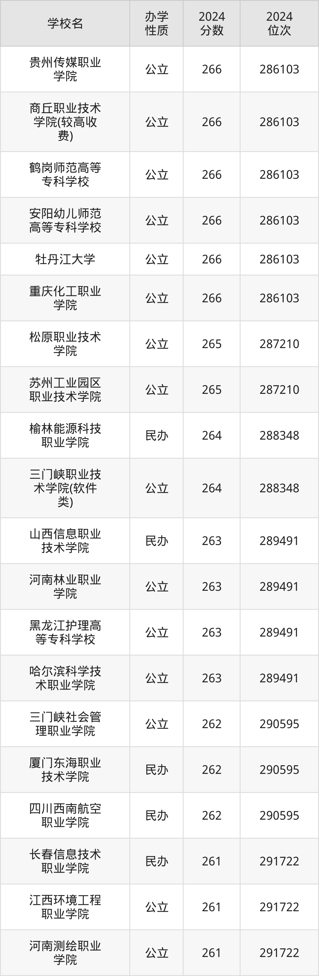 | 贵州传媒职业 学院 | 266 | 286103 |