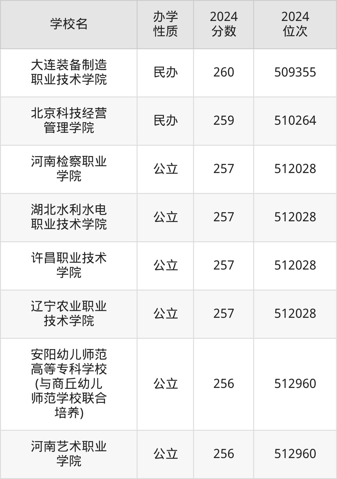 2024年河南理科261分考生能上山东艺术设计职业学院、商丘职业技术学院、南阳职业学院、安阳幼儿师范高等专科学校、江西洪州职业学院等28所专科院校,具体录取分数线及位次为: