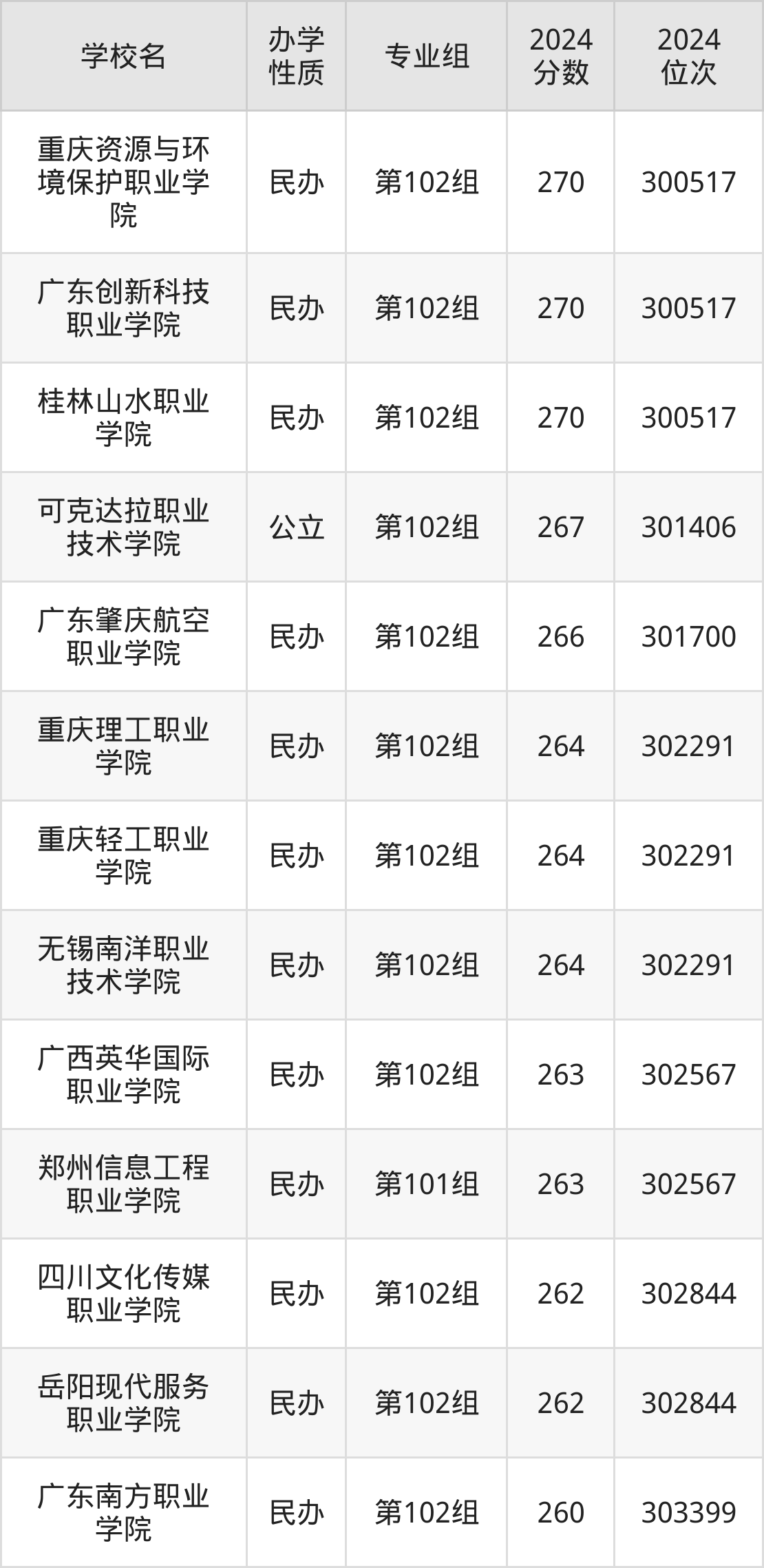 | 广东南方职业 学院 | 第102组 | 260 | 303399 |