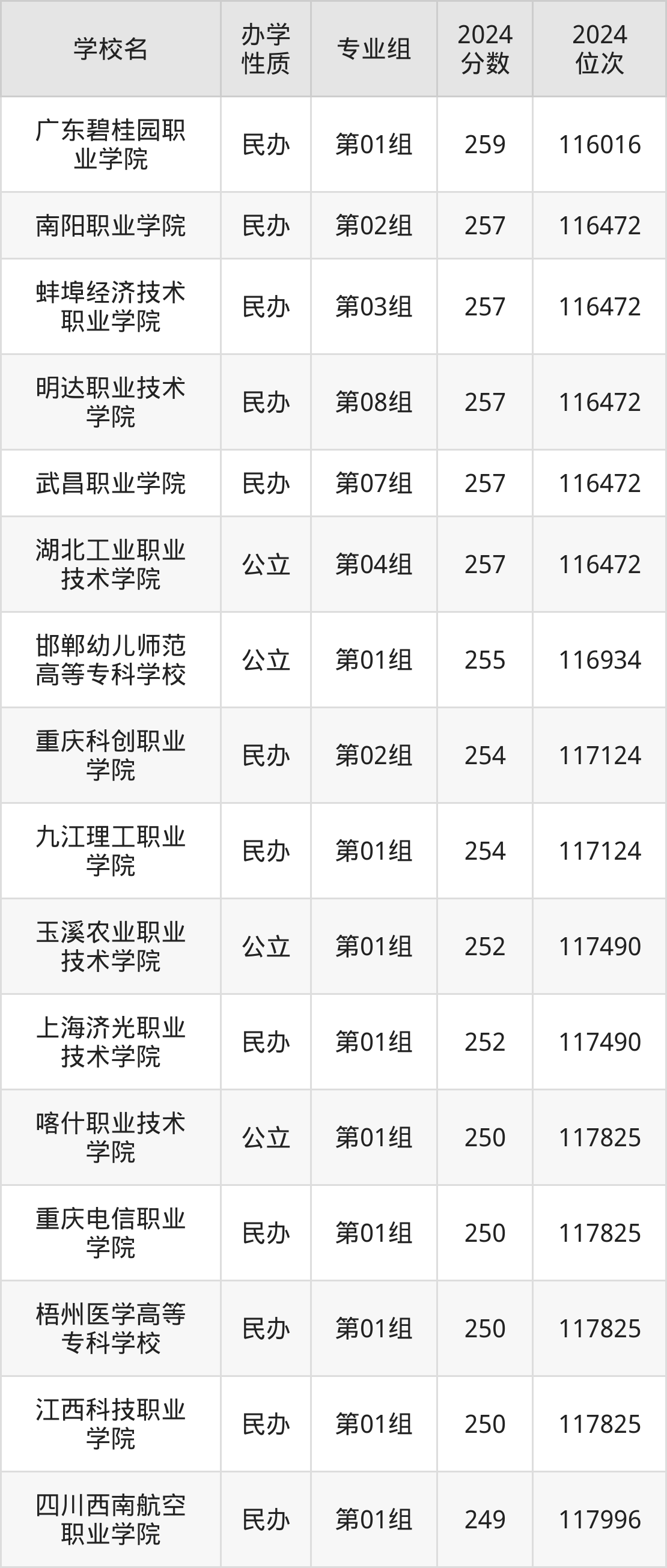 2024年湖北历史类254分考生能上广东碧桂园职业学院、南阳职业学院、蚌埠经济技术职业学院、明达职业技术学院、武昌职业学院等16所专科院校,具体录取分数线及位次为: