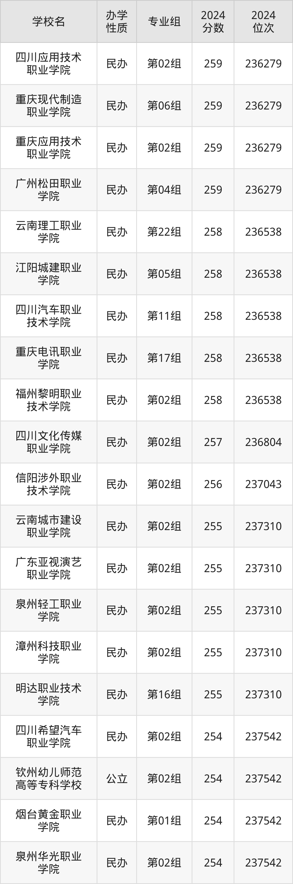 2024年湖北物理类254分考生能上四川应用技术职业学院、重庆现代制造职业学院、重庆应用技术职业学院、广州松田职业学院、云南理工职业学院等37所专科院校,具体录取分数线及位次为: