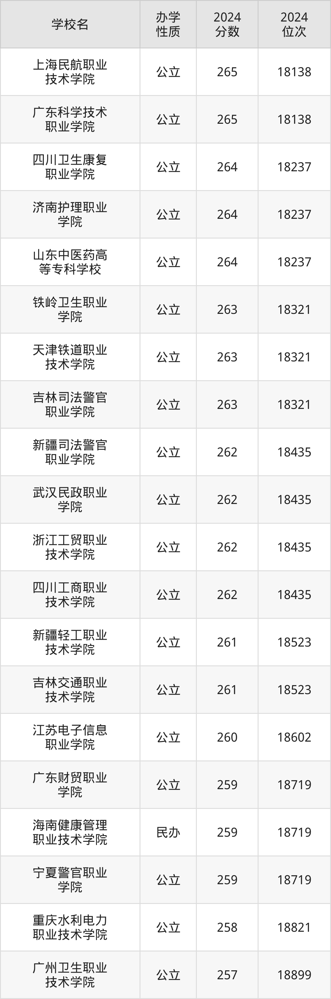 2024年新疆文科260分考生能上上海民航职业技术学院、广东科学技术职业学院、四川卫生康复职业学院、济南护理职业学院、山东中医药高等专科学校等25所专科院校,具体录取分数线及位次为: