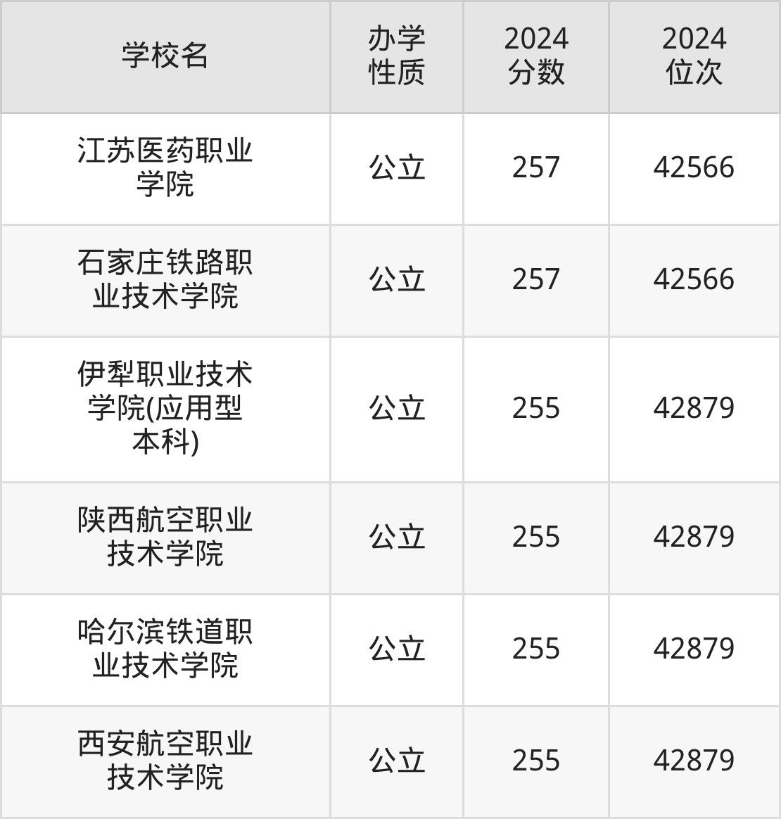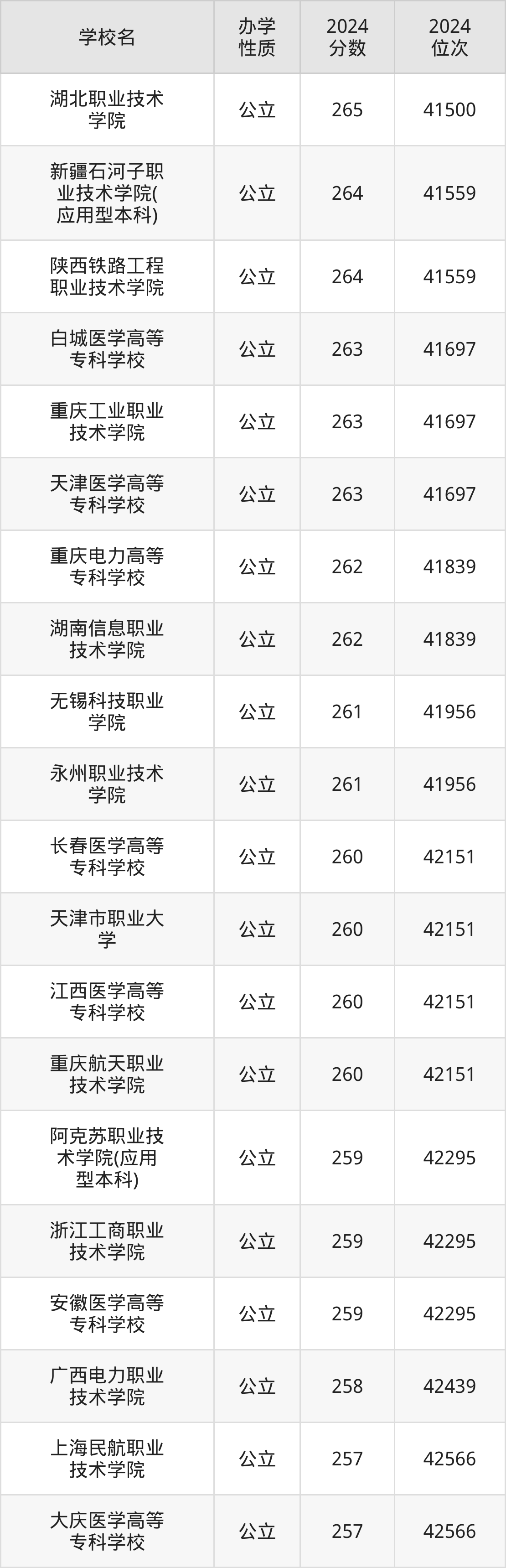 2024年新疆理科260分考生能上湖北职业技术学院、新疆石河子职业技术学院(应用型本科)、陕西铁路工程职业技术学院、白城医学高等专科学校、重庆工业职业技术学院等26所专科院校,具体录取分数线及位次为: