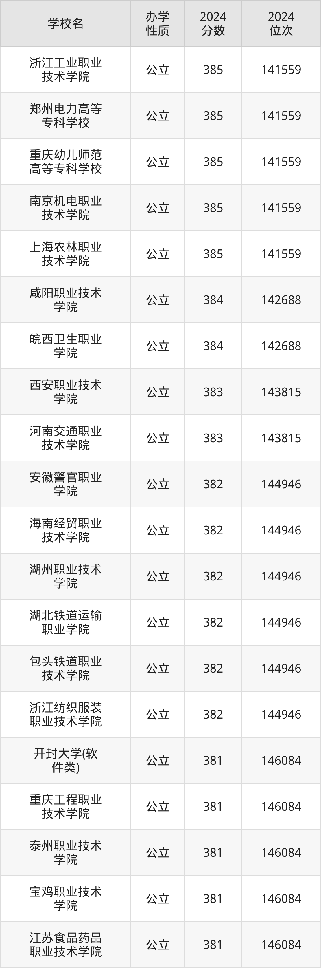 2024年河南文科380分考生能上浙江工业职业技术学院、郑州电力高等专科学校、重庆幼儿师范高等专科学校、南京机电职业技术学院、上海农林职业技术学院等46所专科院校,具体录取分数线及位次为: