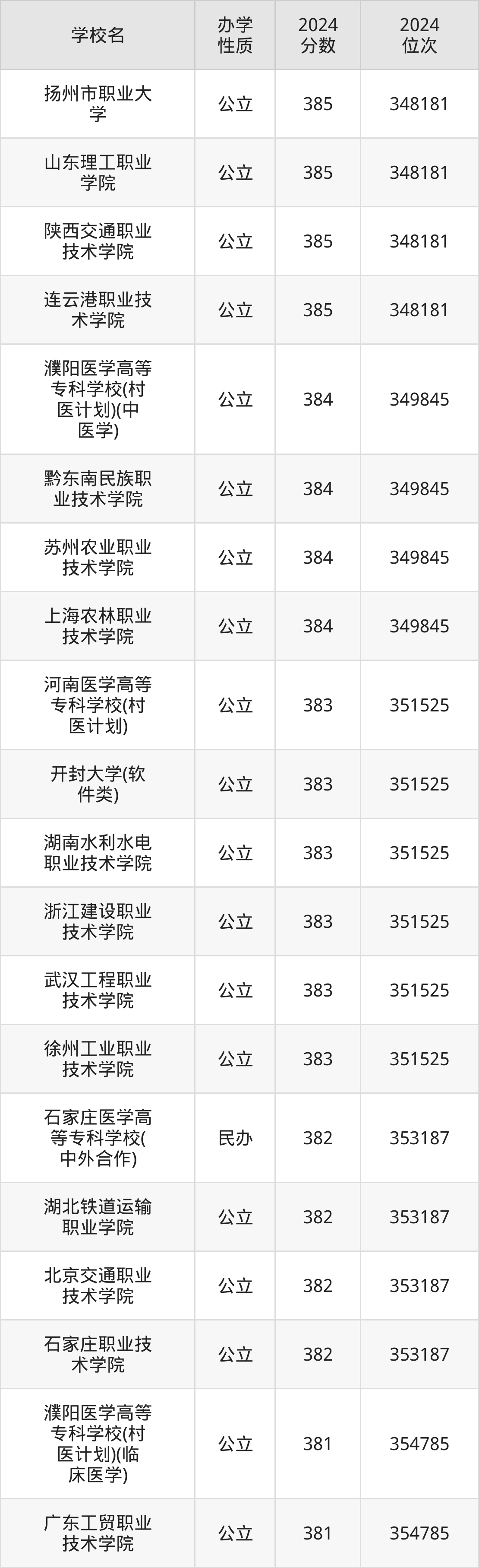 2024年河南理科380分考生能上扬州市职业大学、山东理工职业学院、陕西交通职业技术学院、连云港职业技术学院、濮阳医学高等专科学校(村医计划)(中医学)等62所专科院校,具体录取分数线及位次为: