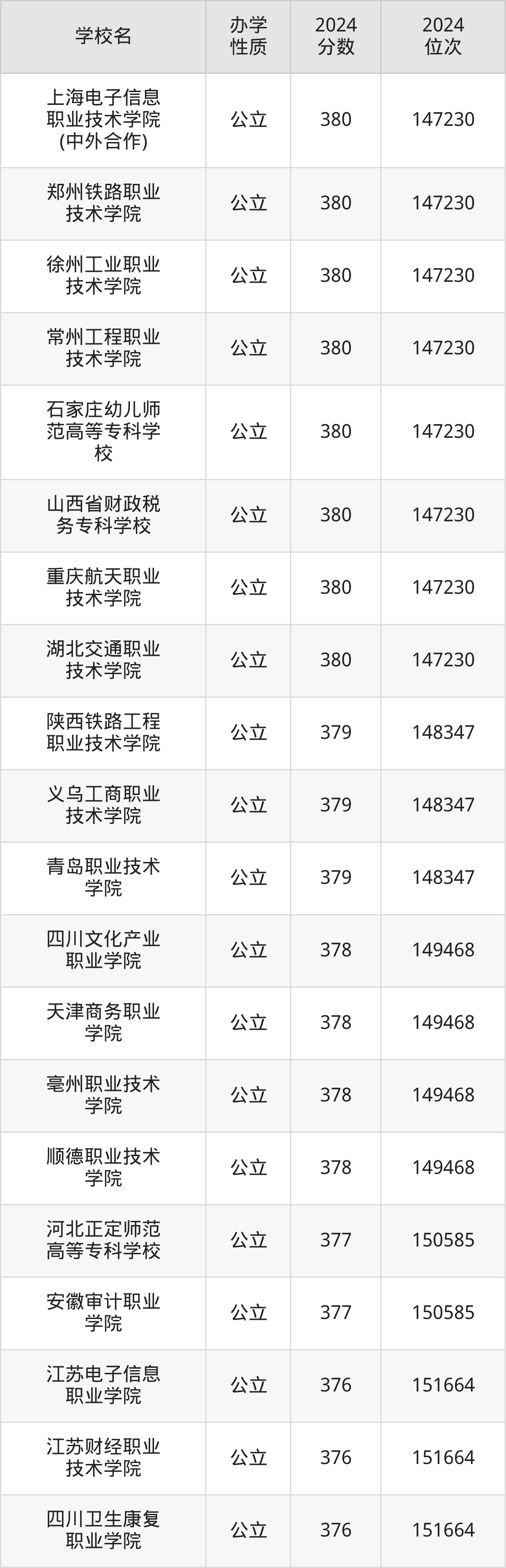 | 郑州铁路职业 技术学院 | 380 | 147230 |
